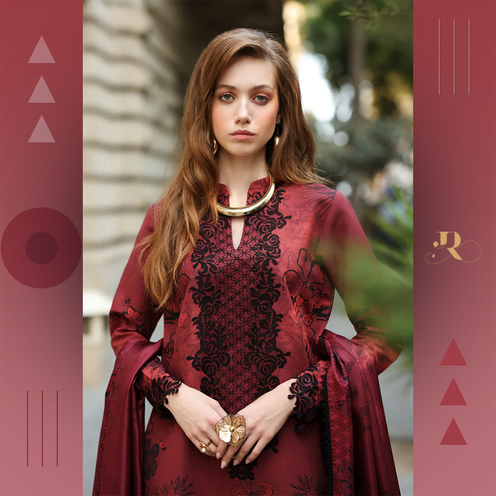 Printed khaddar shirt and trousers with embroidered neckline and herringbone shawl. Timeless winter elegance.