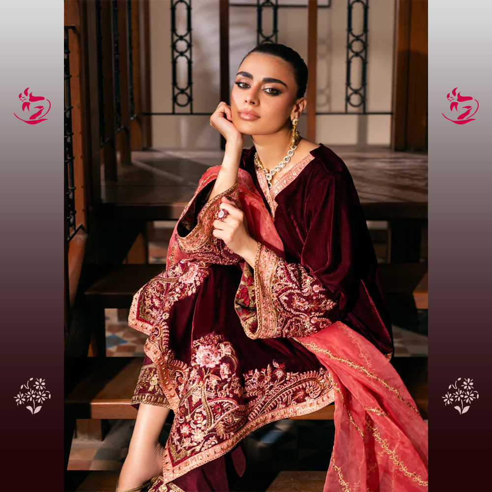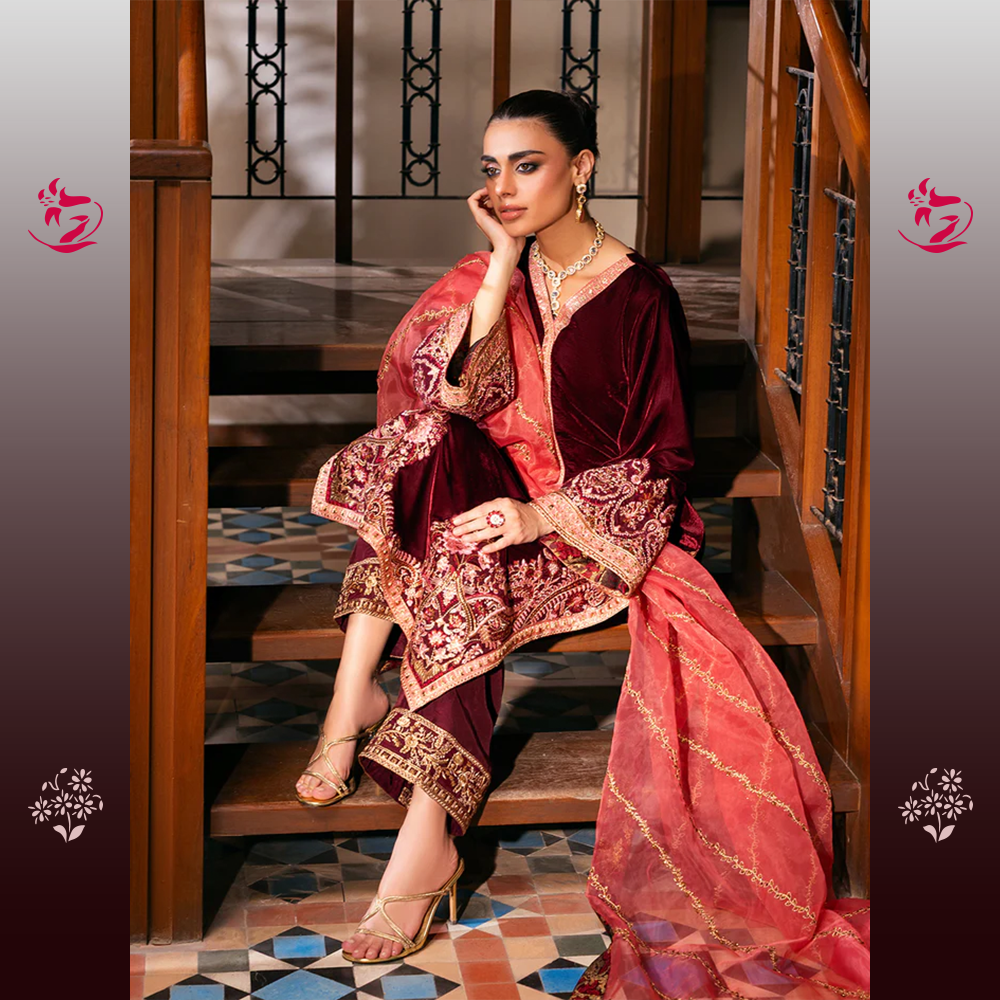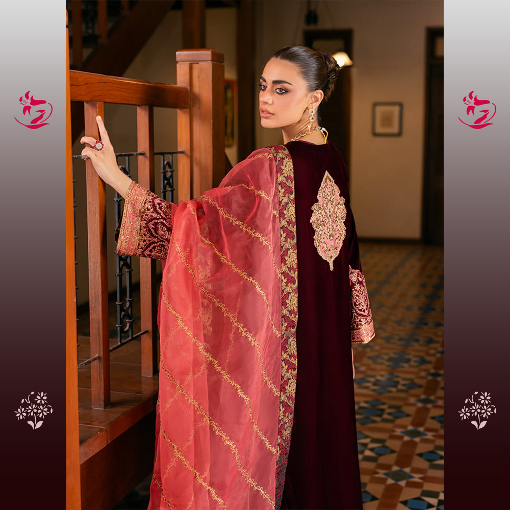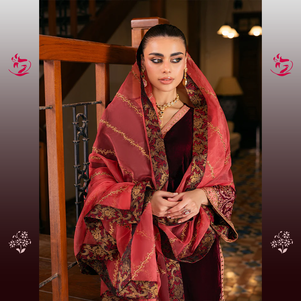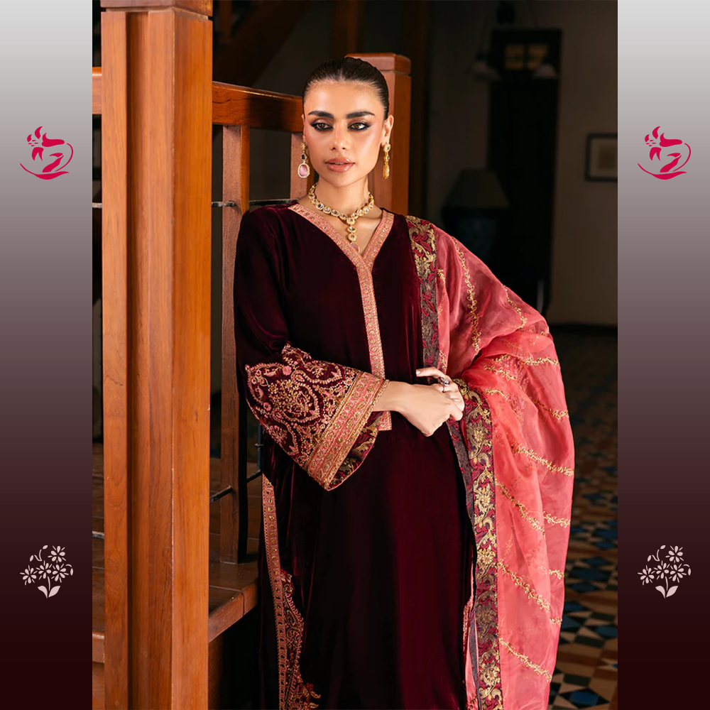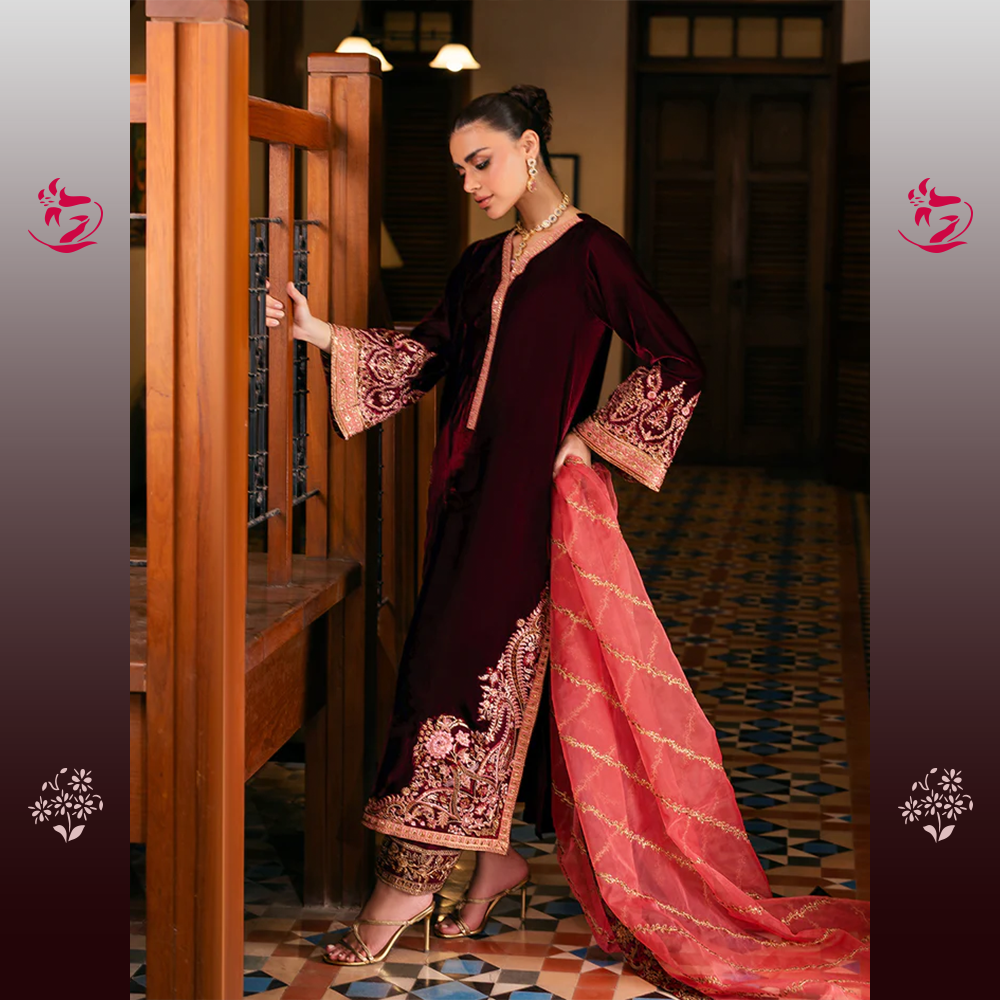 A breathtaking unstitched three-piece velvet ensemble. The shirt is crafted from luxurious Wine-Red Velvet, a deep, rich hue that exudes classic sophistication. The shirt is tastefully adorned with exquisite tone-on-tone embroidery, featuring elaborate Mughal-inspired motifs along the hem, neckline, and flared cuffs. The intricate work is done primarily in a dull antique gold thread and self-colored velvet appliqués, lending it a textured, heirloom finish. The accompanying raw silk trousers feature a finely detailed border at the cuffs, completing the monochromatic luxury of the suit. This stunning outfit is complemented by a contrasting Deep Burnt Orange/Rust Organza Dupatta.