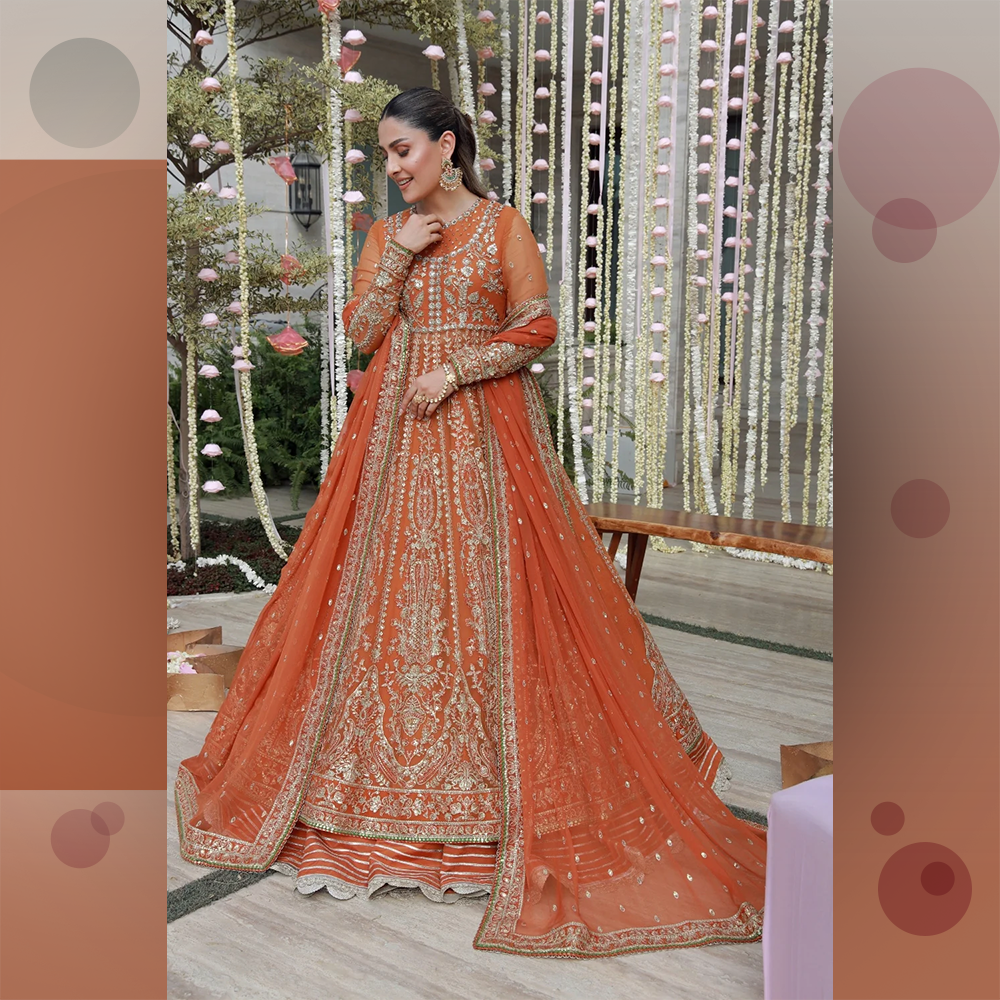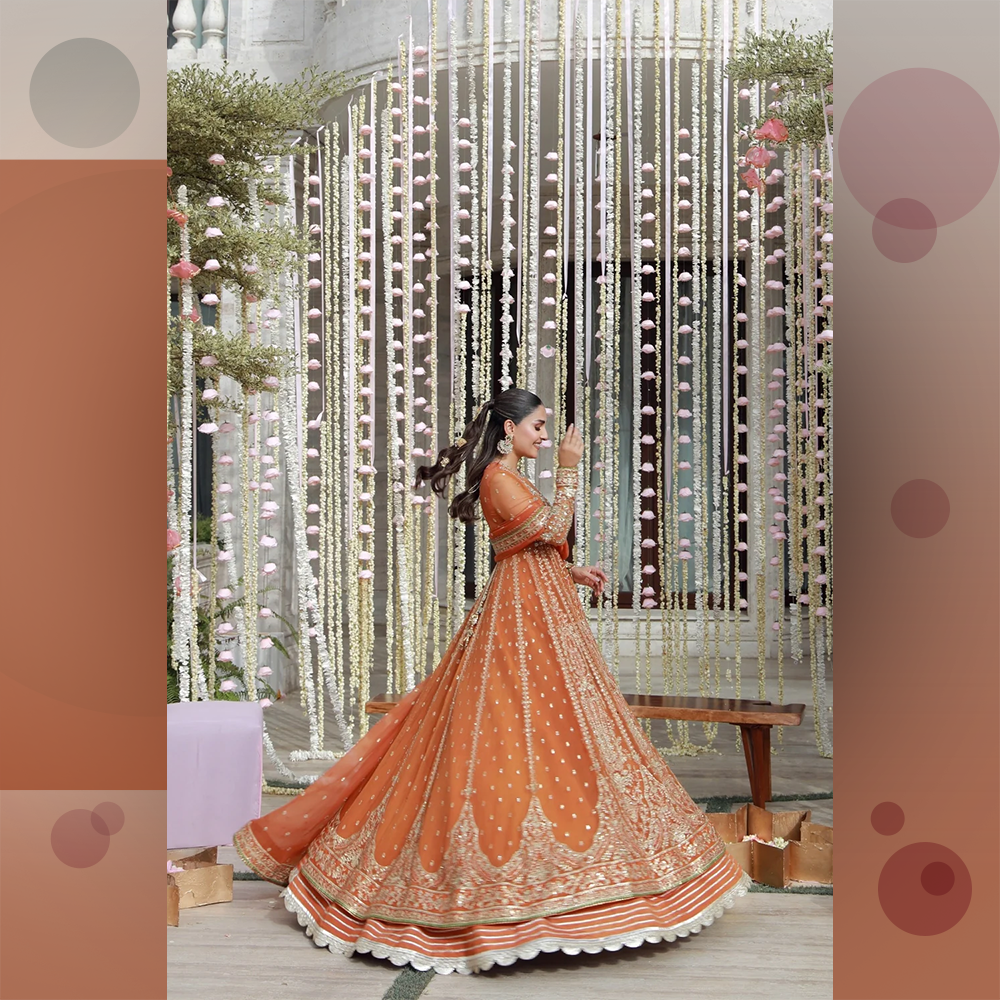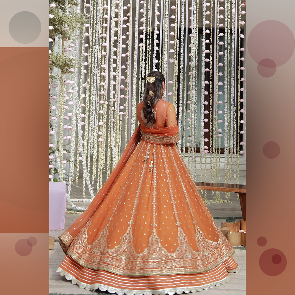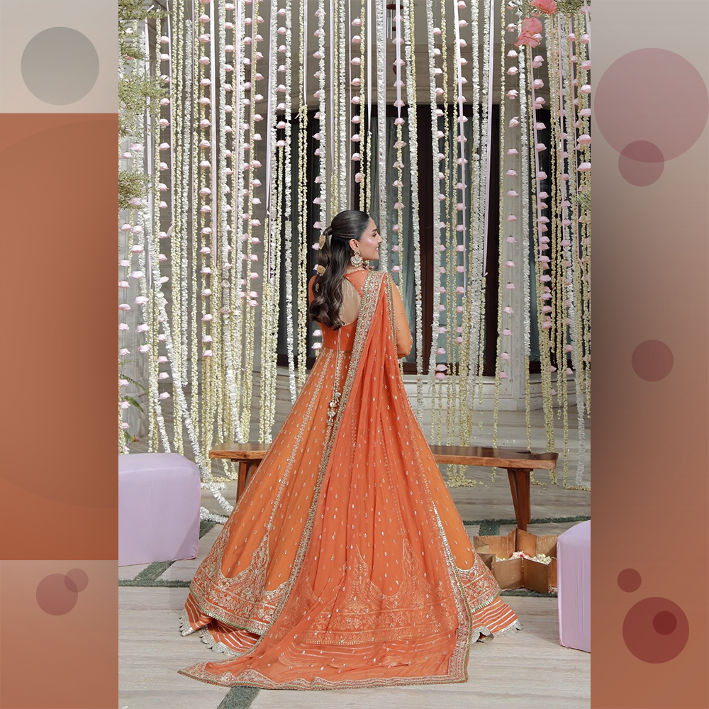 Luxurious embroidered chiffon outfit featuring intricate handwork, chiffon dupatta, and soft raw silk lehnga. Perfect for festive or bridal occasions.