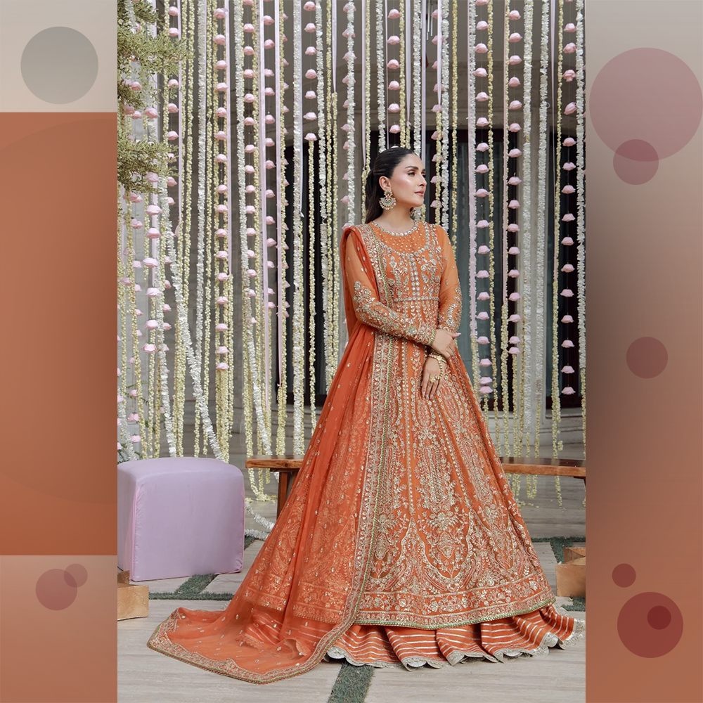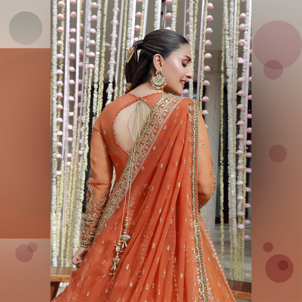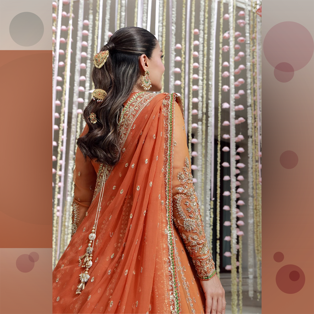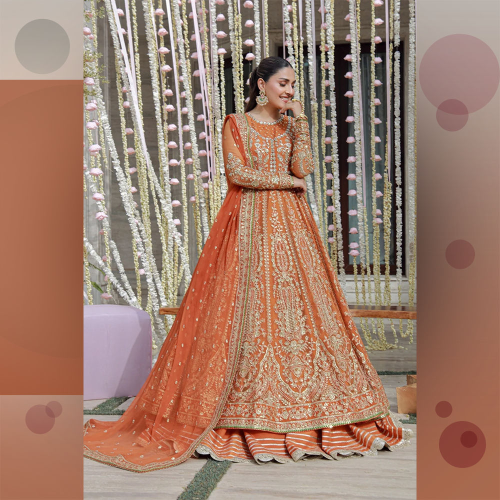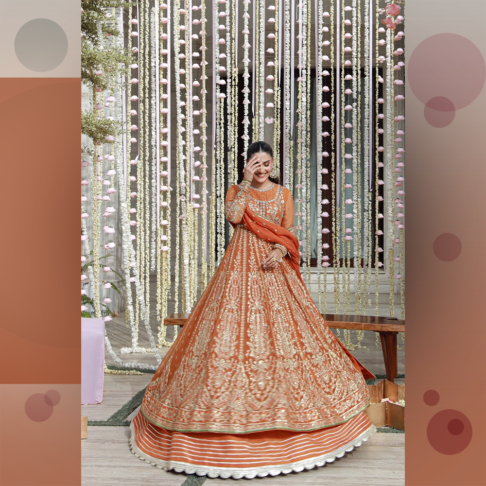 Luxurious embroidered chiffon outfit featuring intricate handwork, chiffon dupatta, and soft raw silk lehnga. Perfect for festive or bridal occasions.