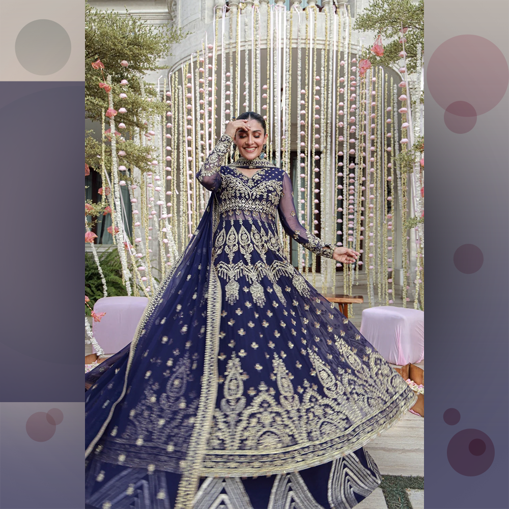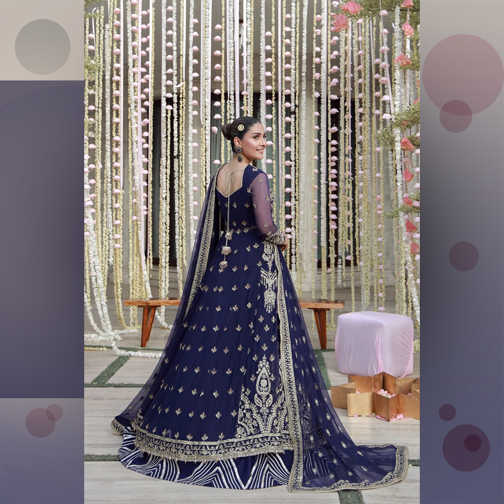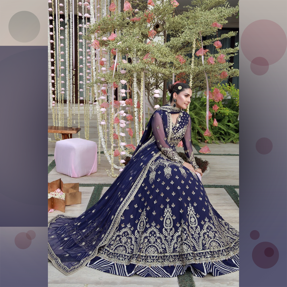 Exquisite embroidered chiffon shirt with hand embellishments, paired with chiffon dupatta and dyed raw silk lehnga. A timeless Gulmina bridal masterpiece for grand occasions.