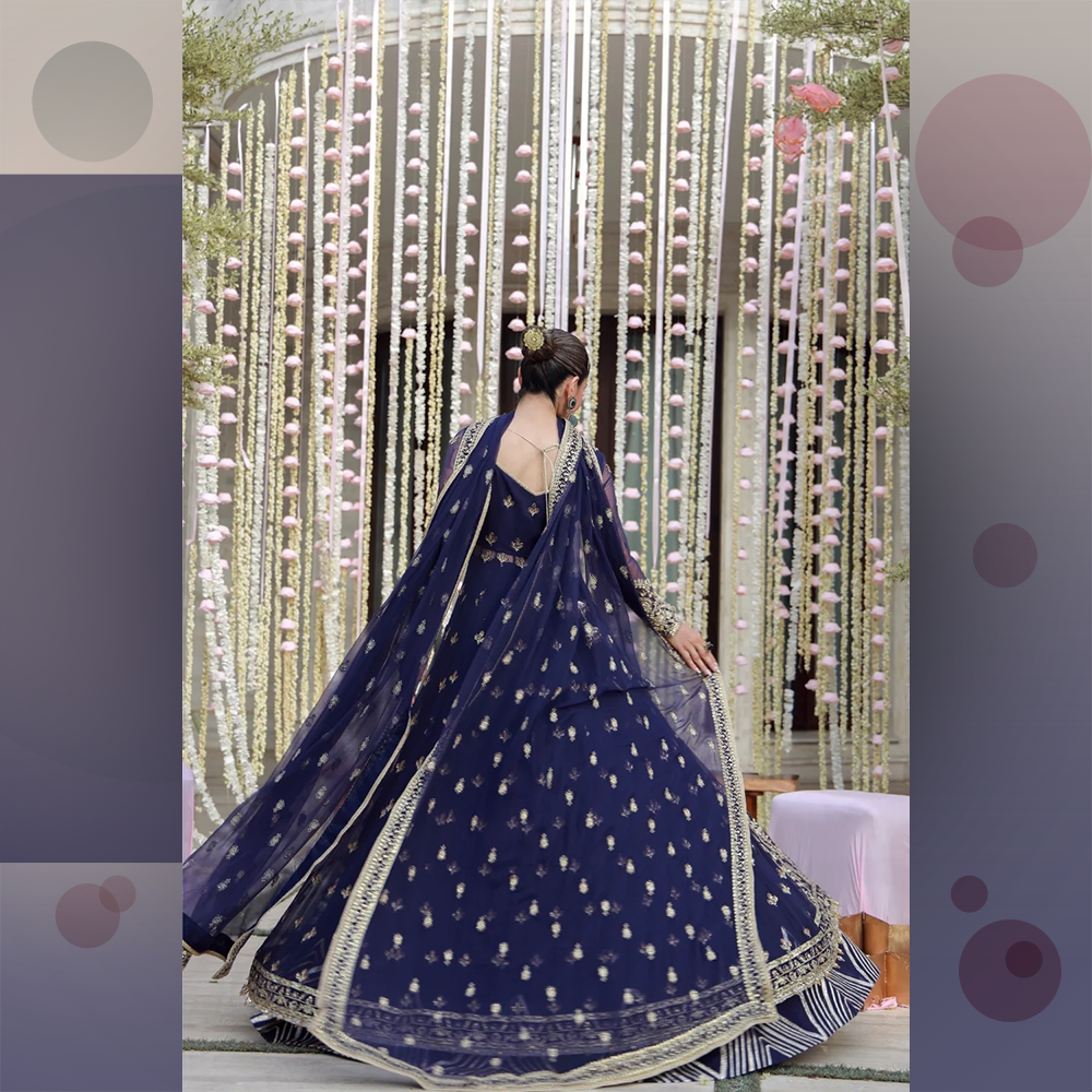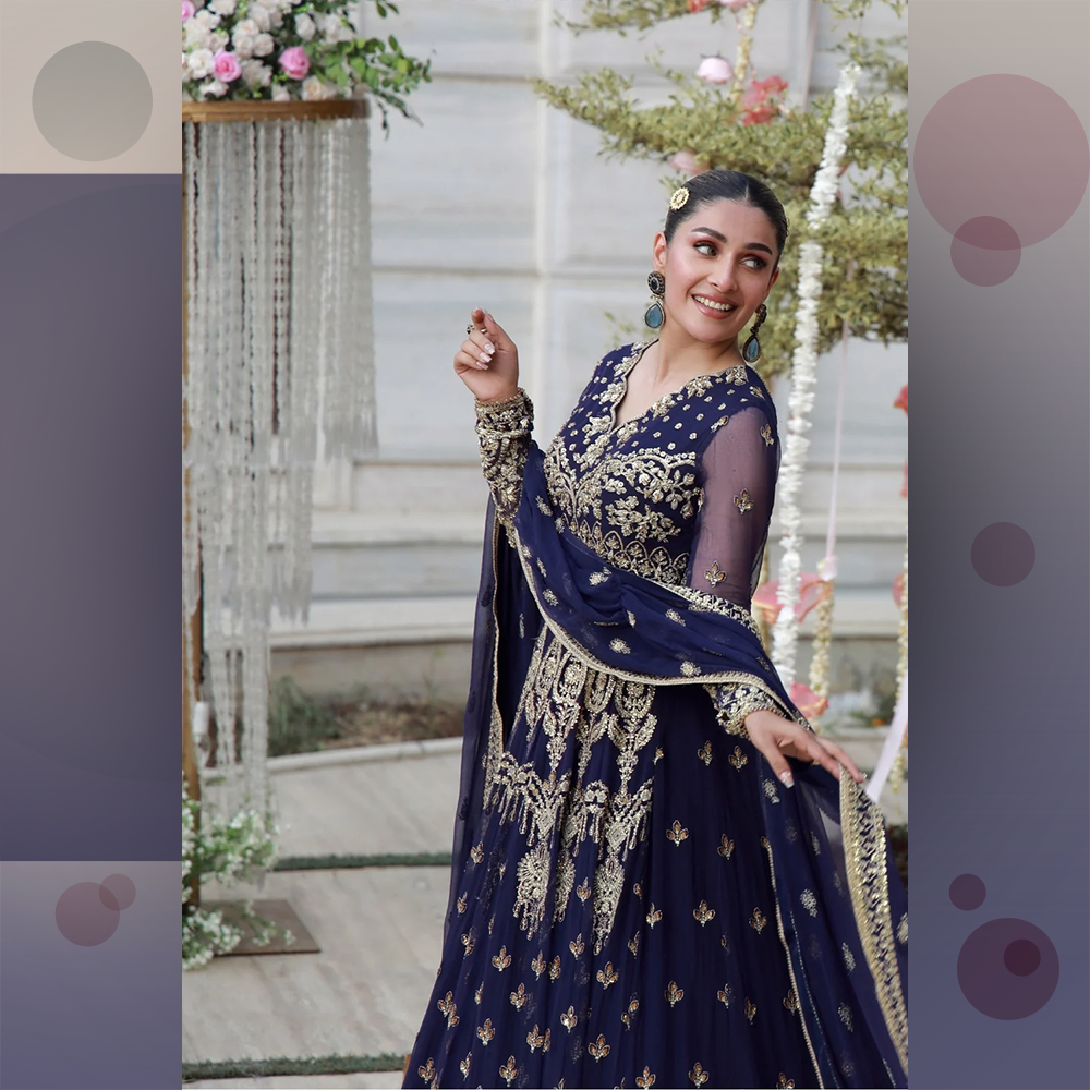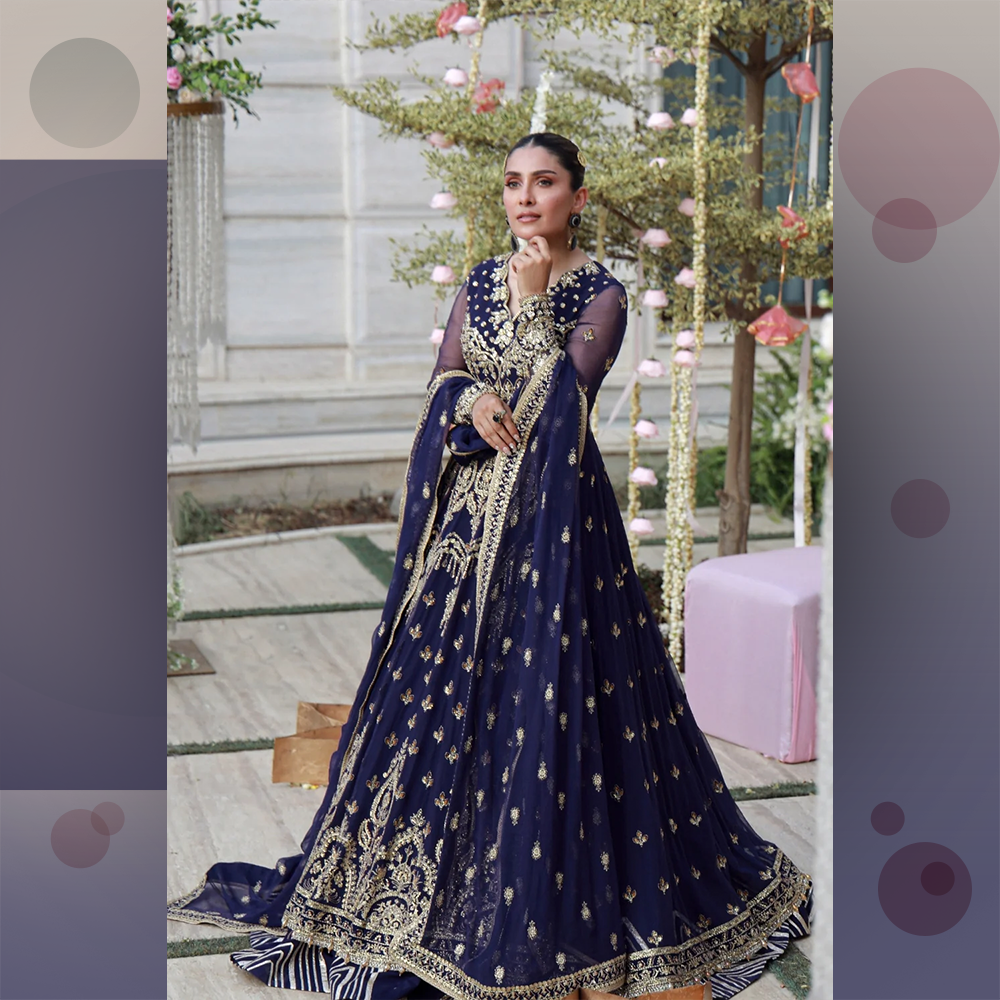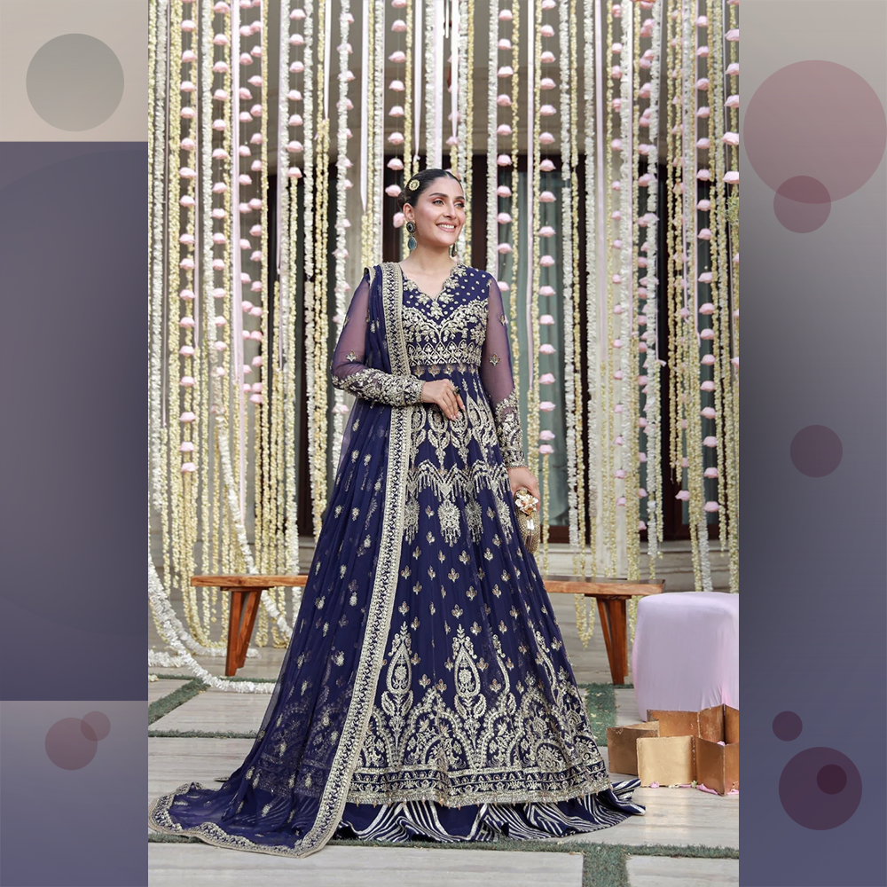 Exquisite embroidered chiffon shirt with hand embellishments, paired with chiffon dupatta and dyed raw silk lehnga. A timeless Gulmina bridal masterpiece for grand occasions.