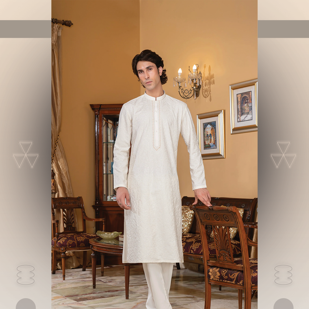 Luxurious men’s blended fabric shalwar kameez offering effortless grace, ideal for weddings, Eid, and special occasions.