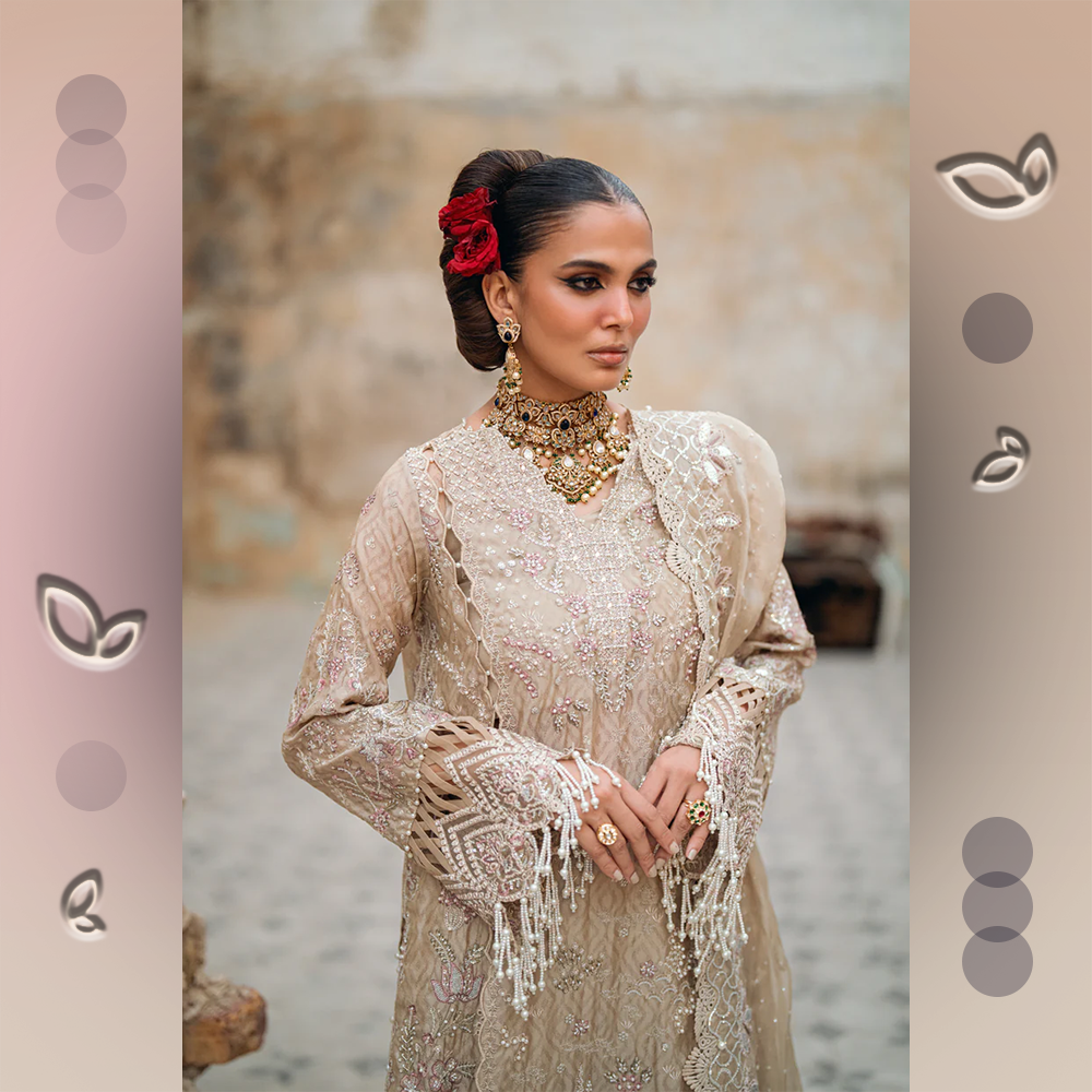 Hand-embellished raw silk shirt with intricate embroidery, paired with embroidered organza dupatta and plain raw silk trousers — perfect for bridal festivities.
