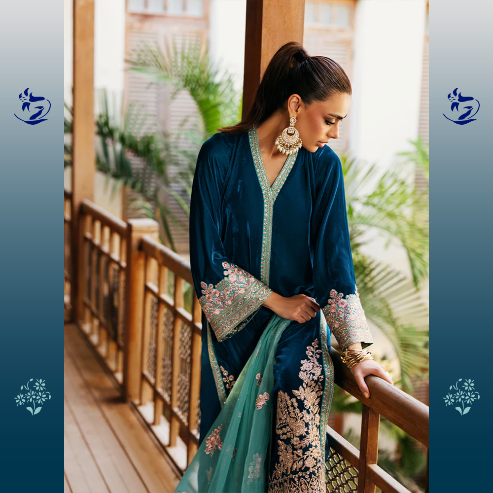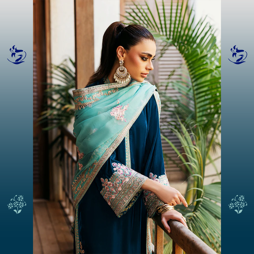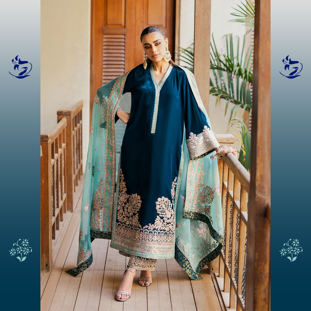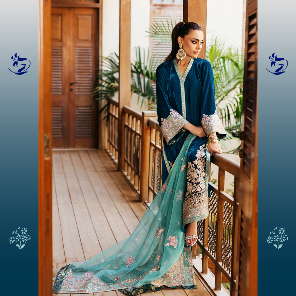 An ethereal and elegant three-piece suit in deep Teal Velvet. The shirt features heavy antique silver and gold thread-work embroidery concentrated on the hemline and wide cuffs. Paired with matching raw silk trousers and a stunning Aqua/Mint Organza Dupatta, which offers a refreshing contrast with its sprawling floral work and heavily detailed silver border.