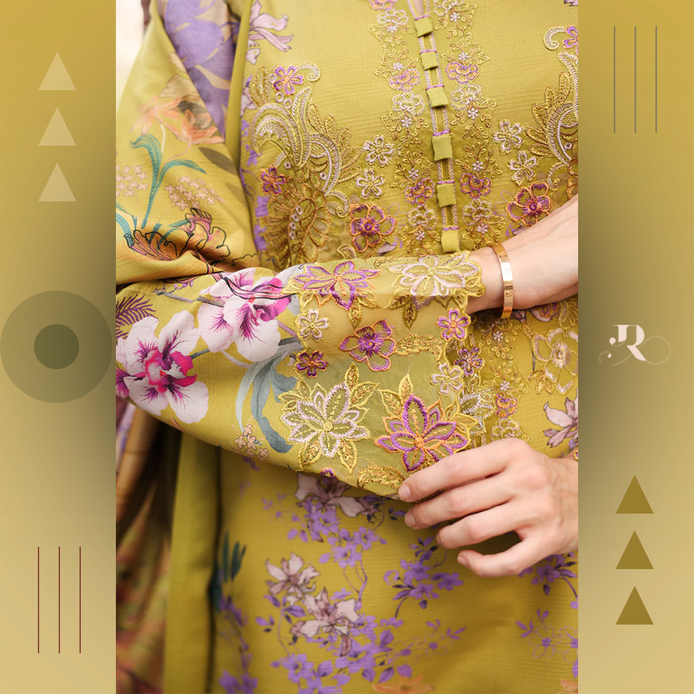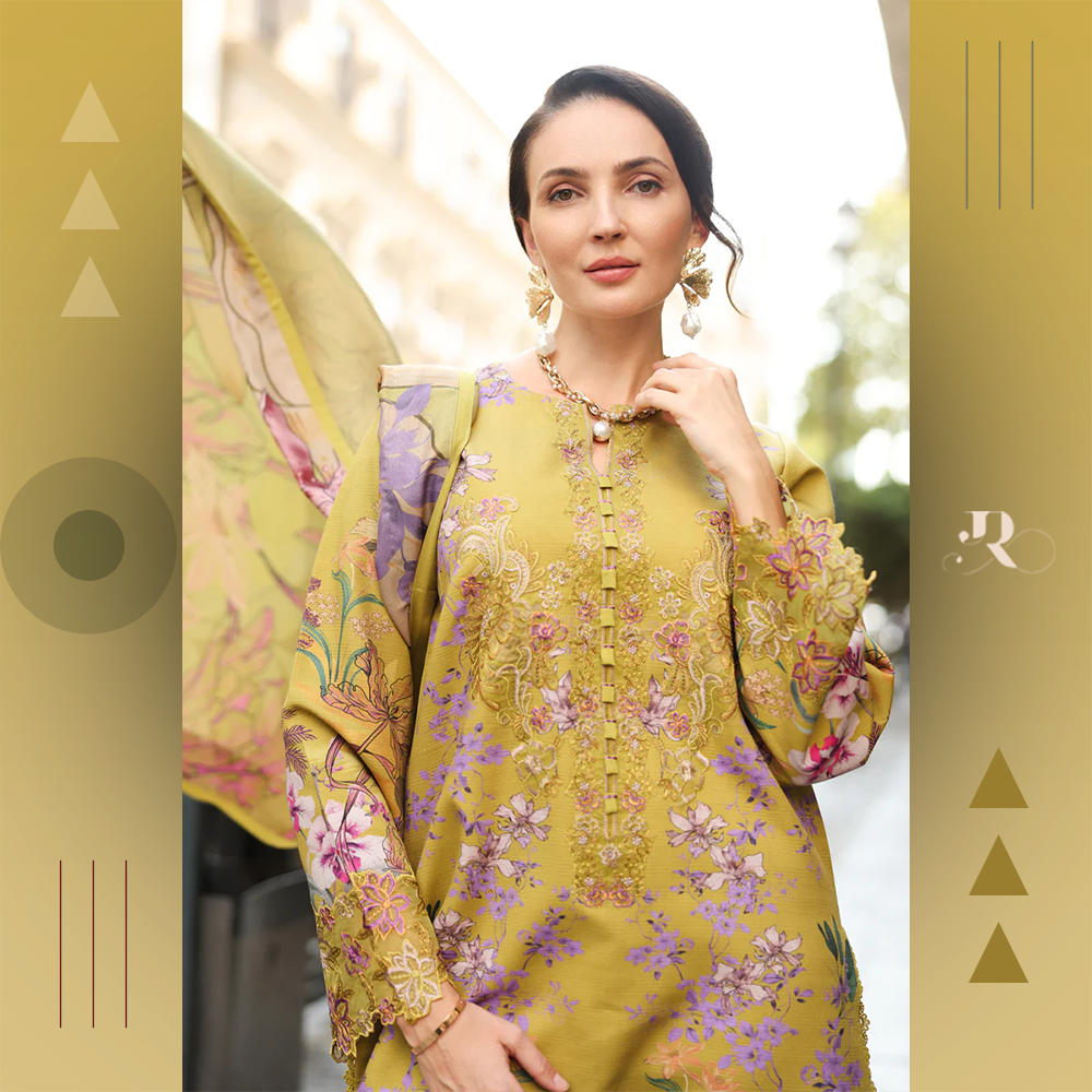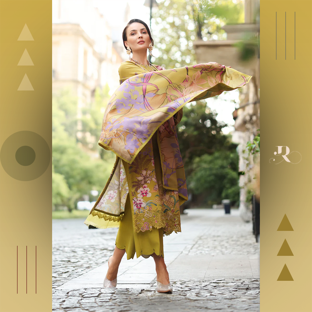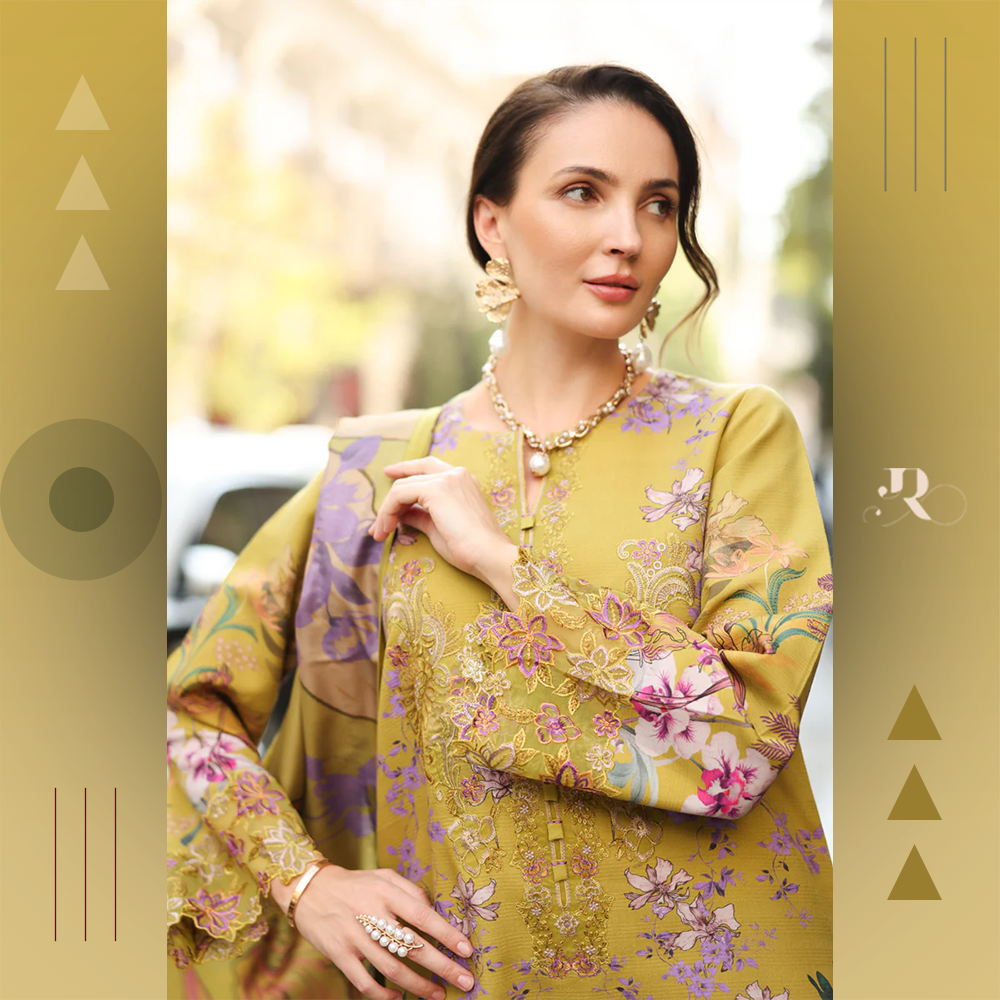 Stylish embroidered neckline on linen fabric with printed shirt, trousers, and shawl. Soft, warm, and elegant.