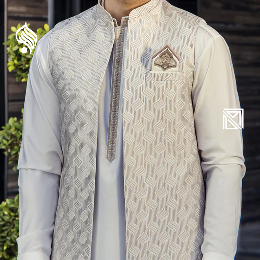 Timeless men’s suit with waistcoat by Riwaj. Crafted from durable suiting fabric for premium fit and festive perfection.
