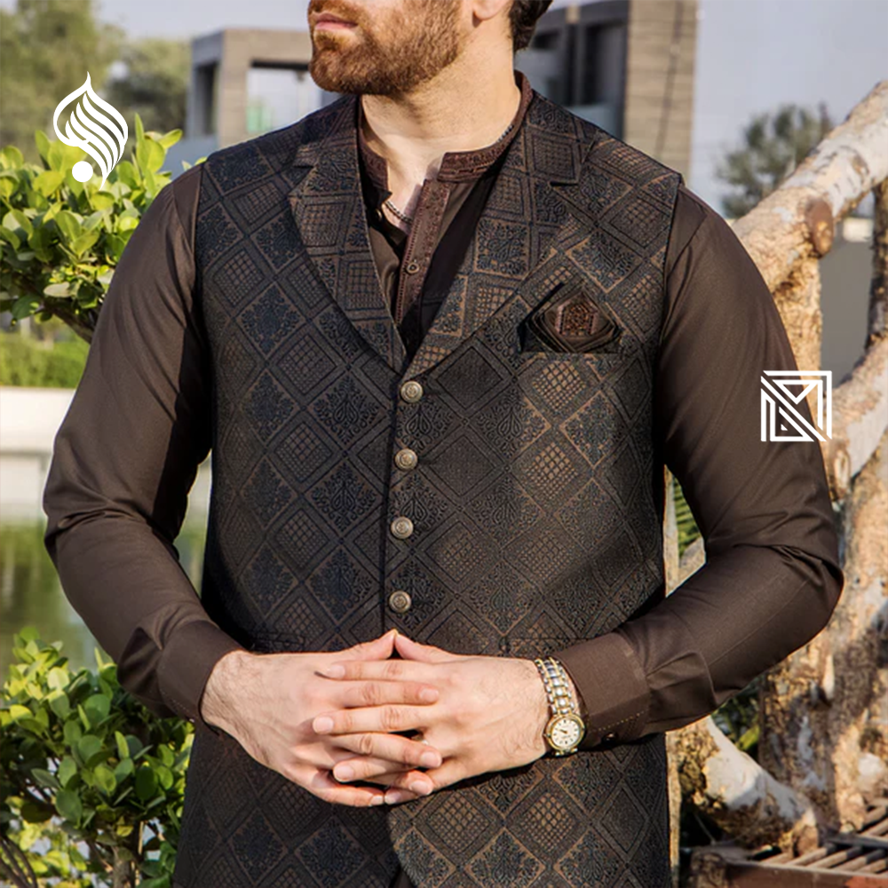 Timeless men’s suit with waistcoat by Riwaj. Crafted from durable suiting fabric for premium fit and festive perfection.