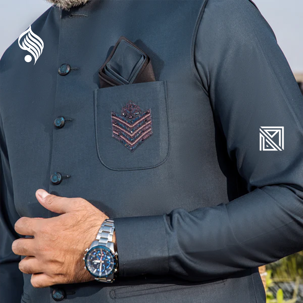 Timeless men’s suit with waistcoat by Riwaj. Crafted from durable suiting fabric for premium fit and festive perfection.