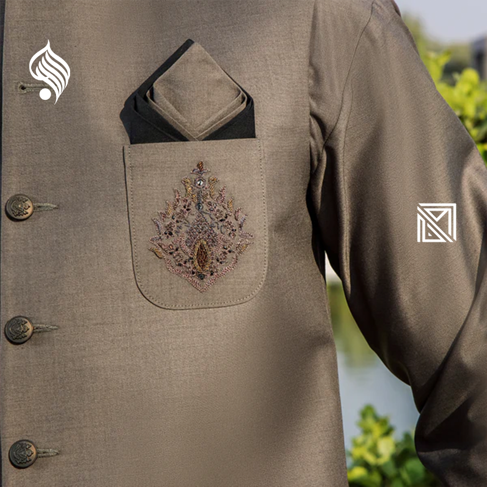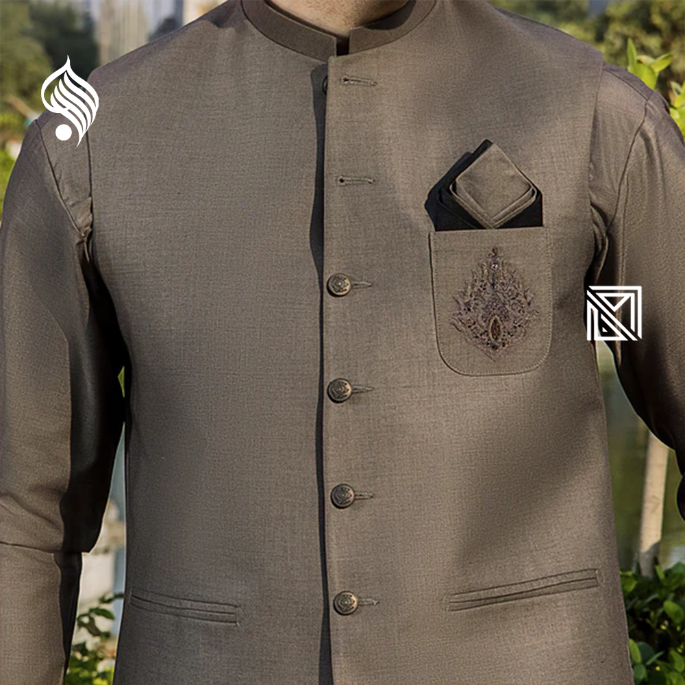 Timeless men’s suit with waistcoat by Riwaj. Crafted from durable suiting fabric for premium fit and festive perfection.