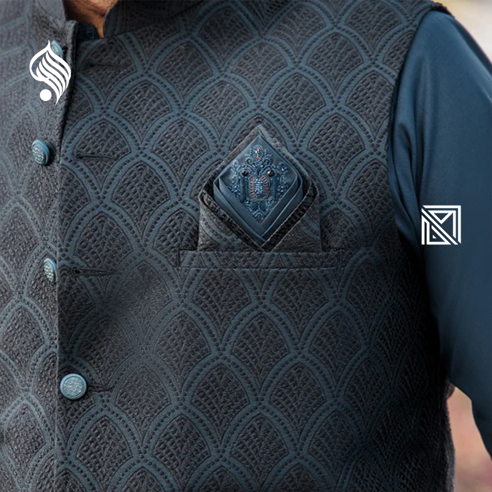 Timeless men’s suit with waistcoat by Riwaj. Crafted from durable suiting fabric for premium fit and festive perfection.