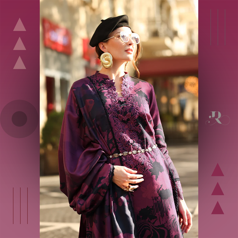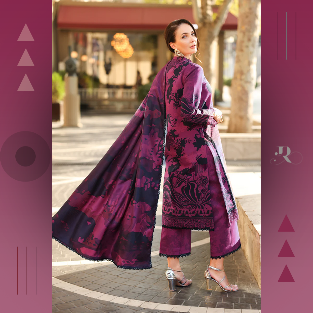 Embroidered organza neckline with printed khaddar shirt, trousers, and herringbone shawl. Elegant unstitched winter suit by Rang Rasiya.