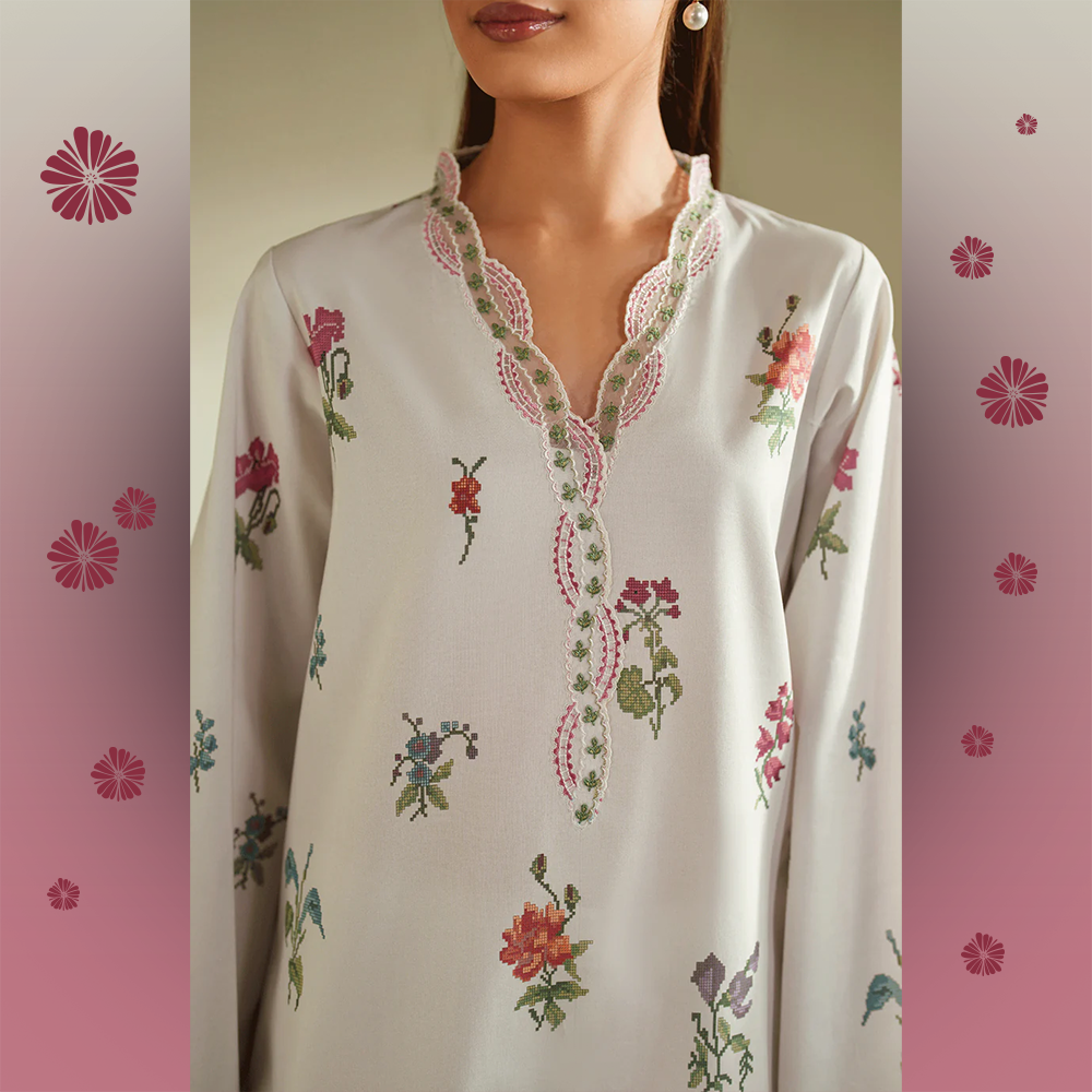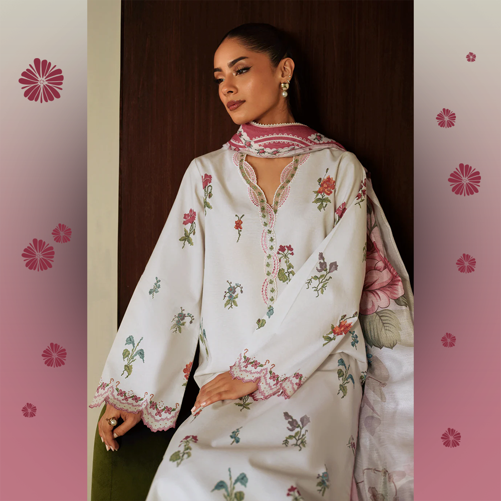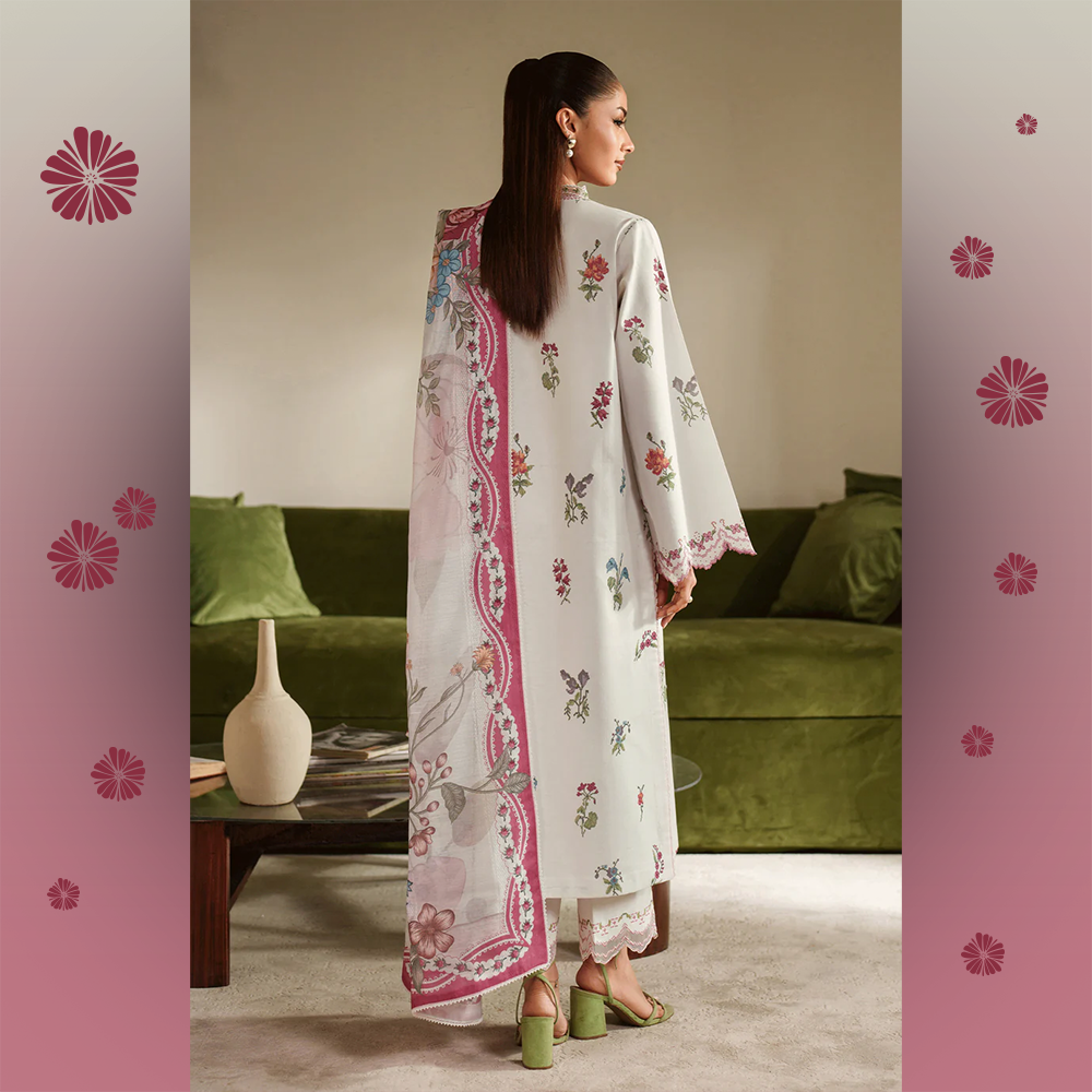 A soft ivory cambric ensemble adorned with delicate multicolor floral prints. Features an intricately embroidered neckline, embroidered sleeve hems, and trouser hem, paired with a vibrant Fancy Monar digital printed dupatta. Finished with scalloped details for a refined, feminine touch.