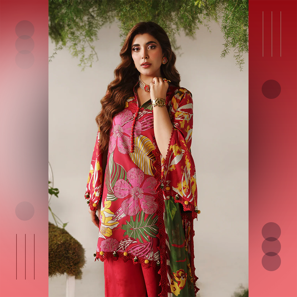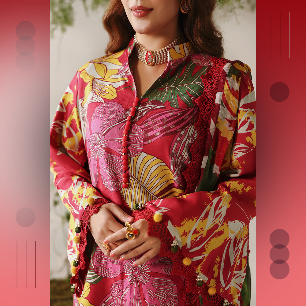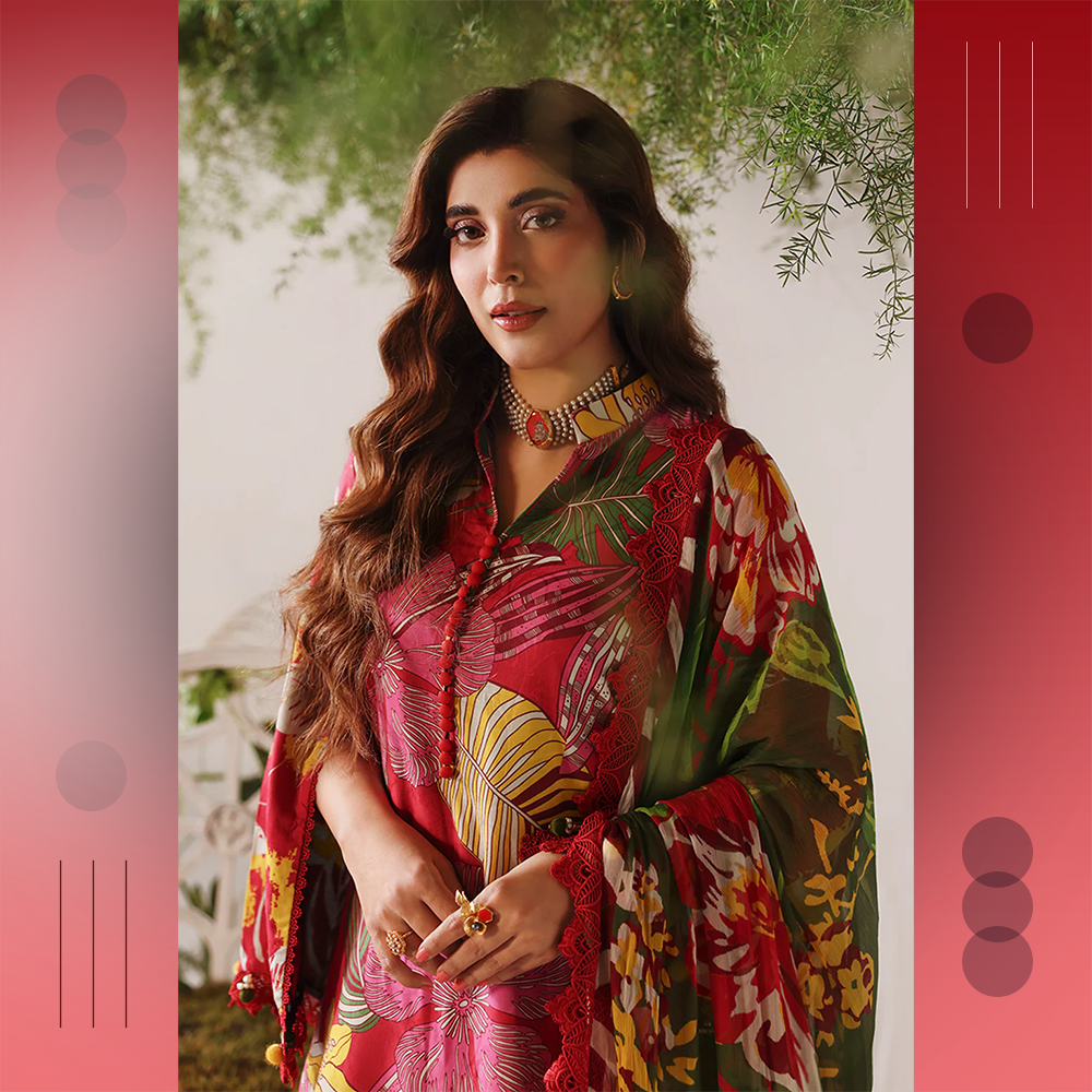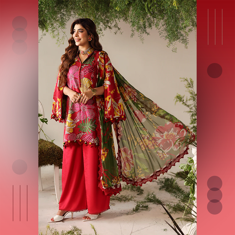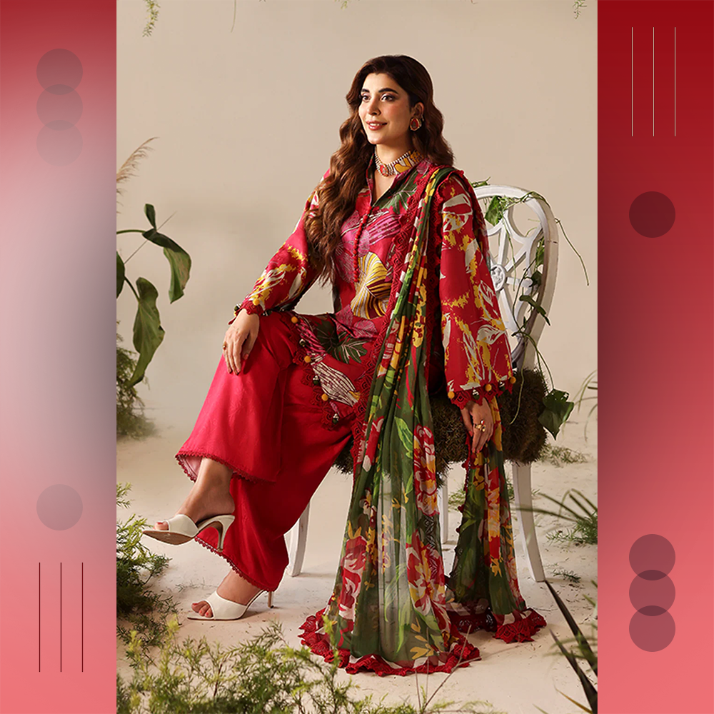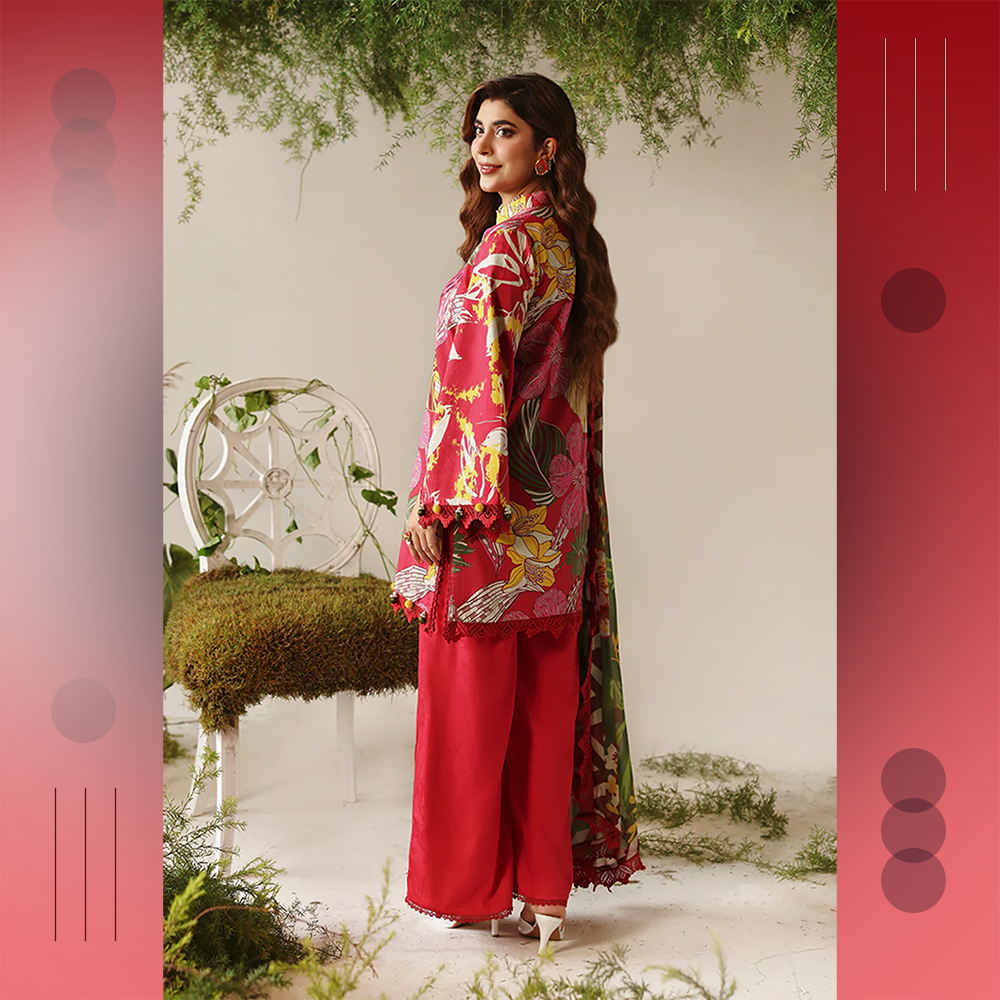 Printed jacquard viscose shirt with chiffon dupatta and dyed trousers. A luxurious unstitched Naqsh 3-piece perfect for festive style.