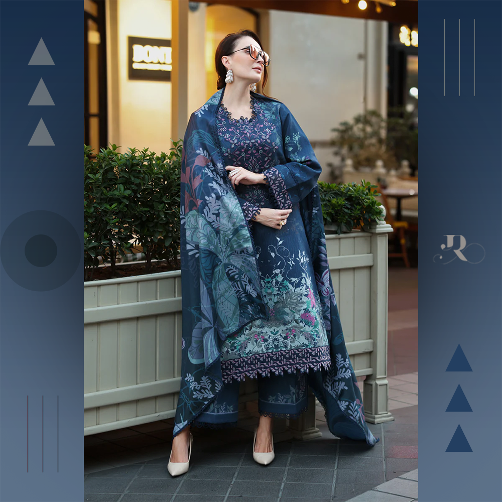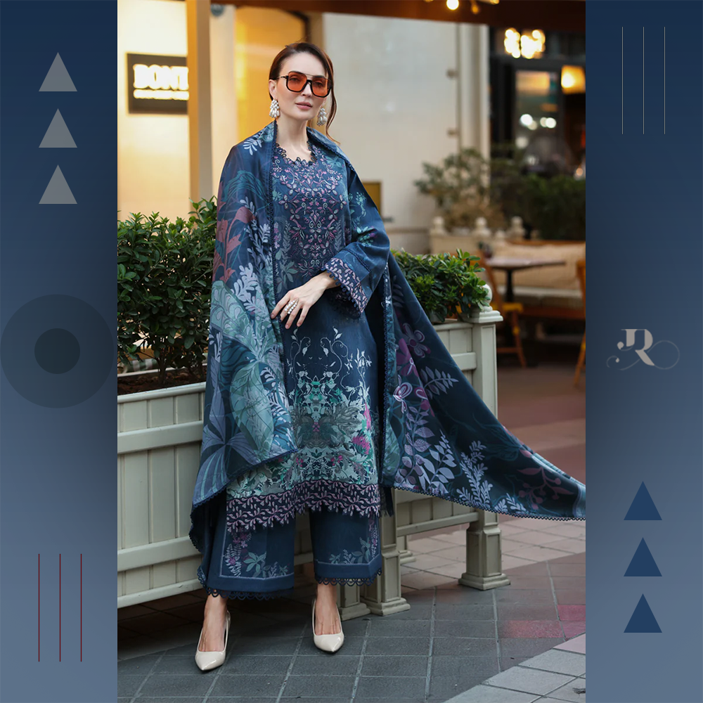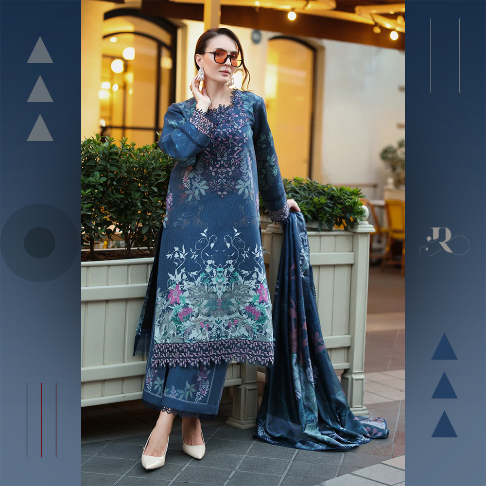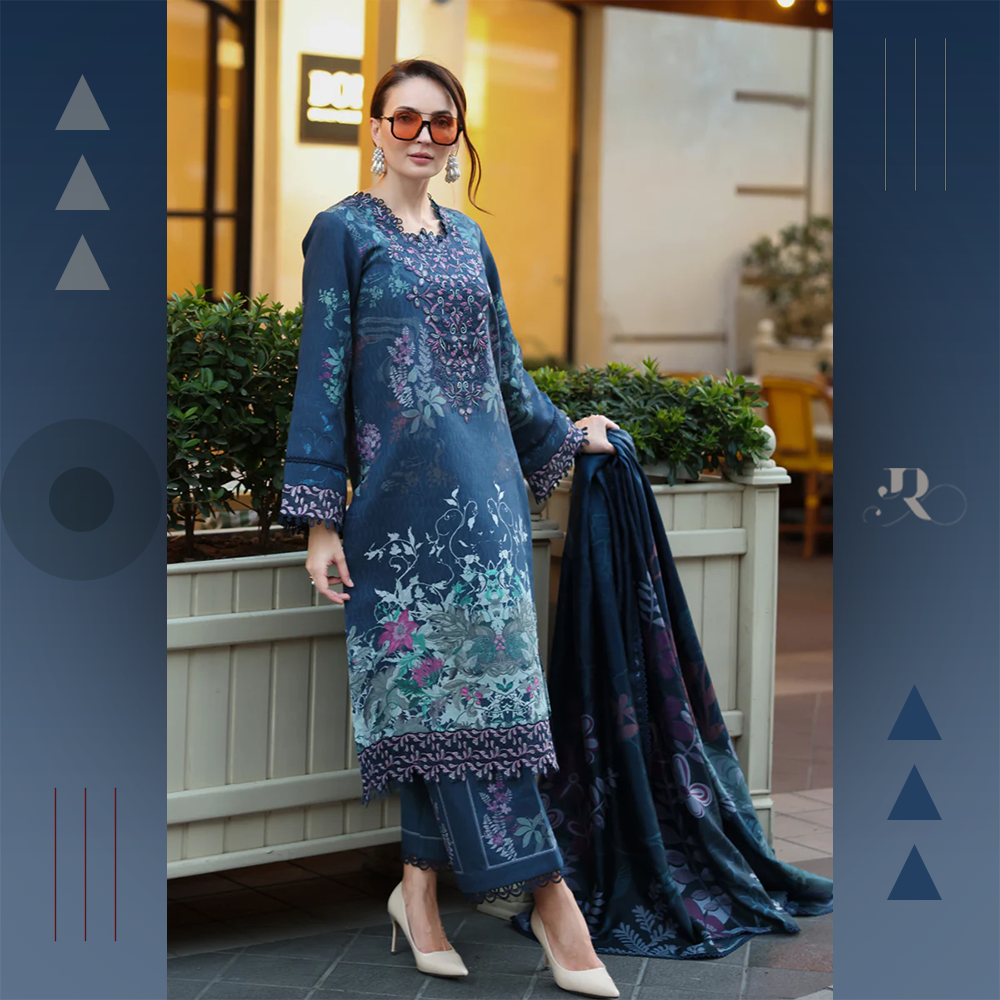 Unstitched khaddar 3-piece featuring organza embroidered front border and printed herringbone shawl for a refined winter look.