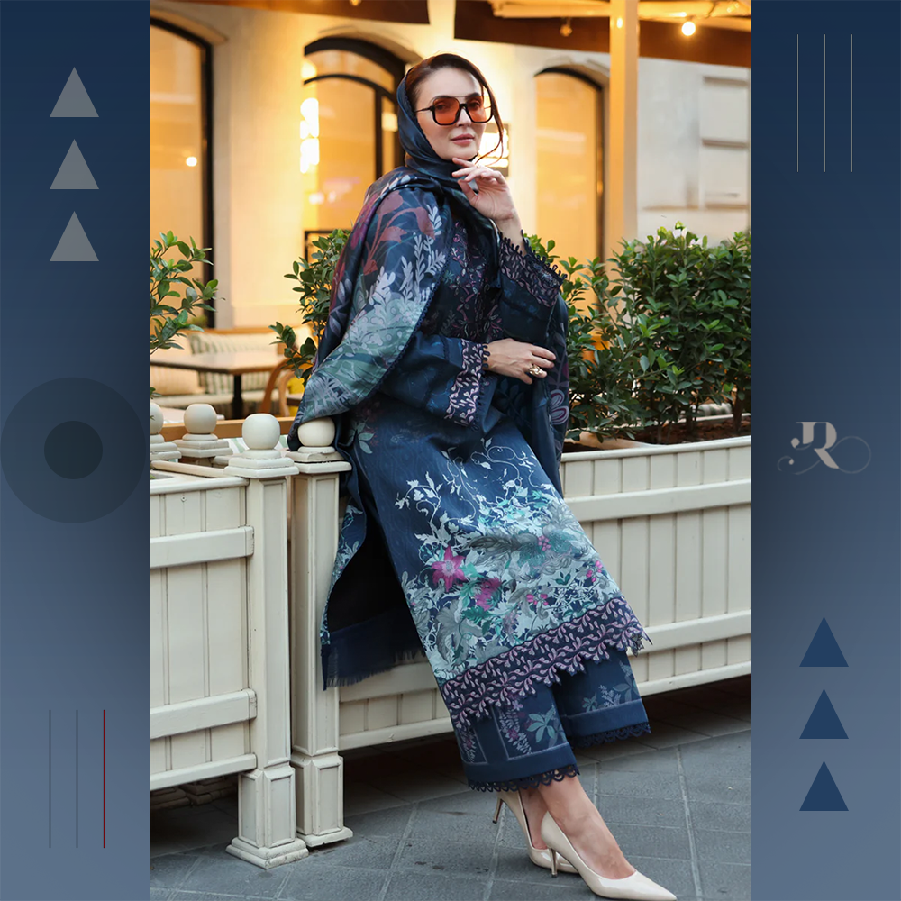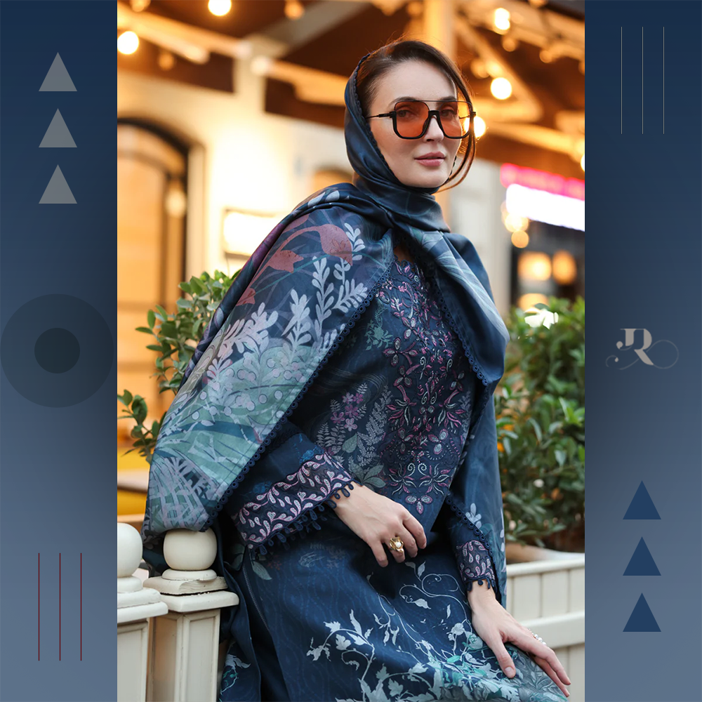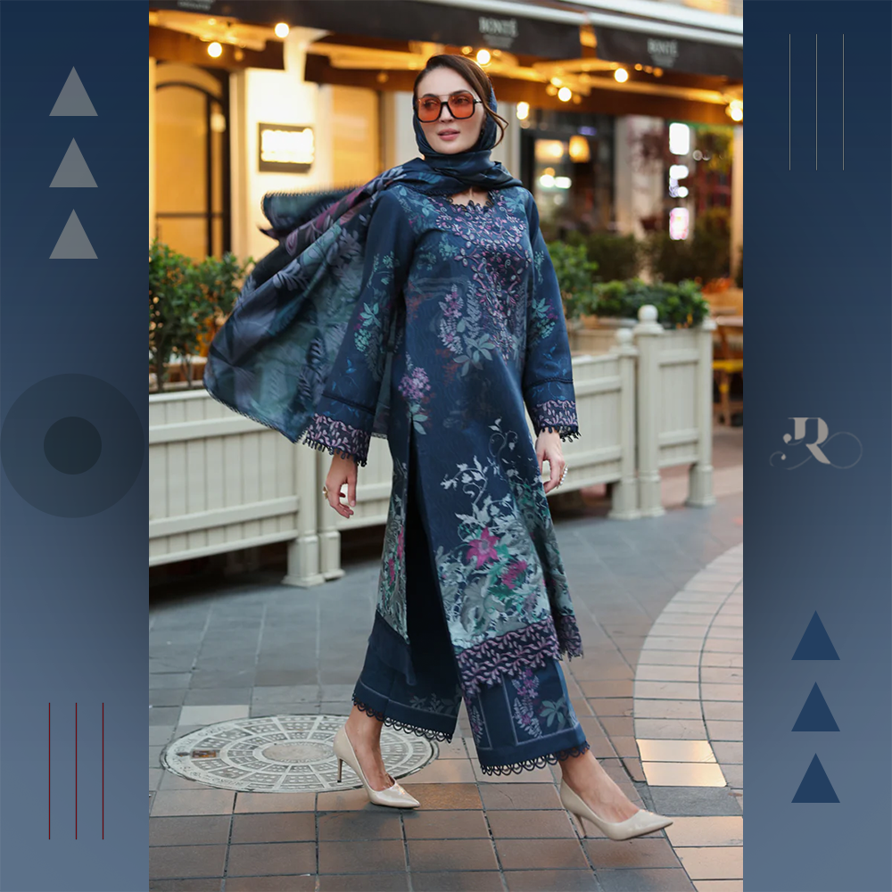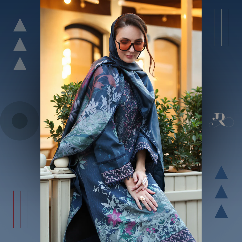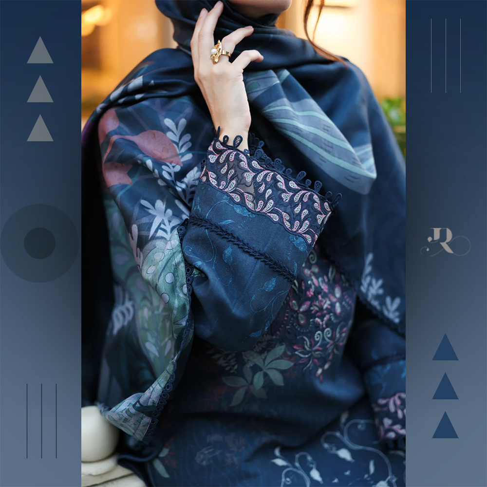 Unstitched khaddar 3-piece featuring organza embroidered front border and printed herringbone shawl for a refined winter look.