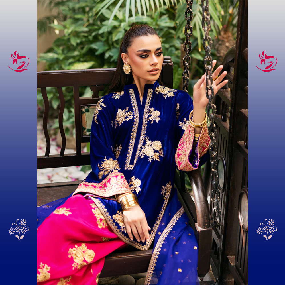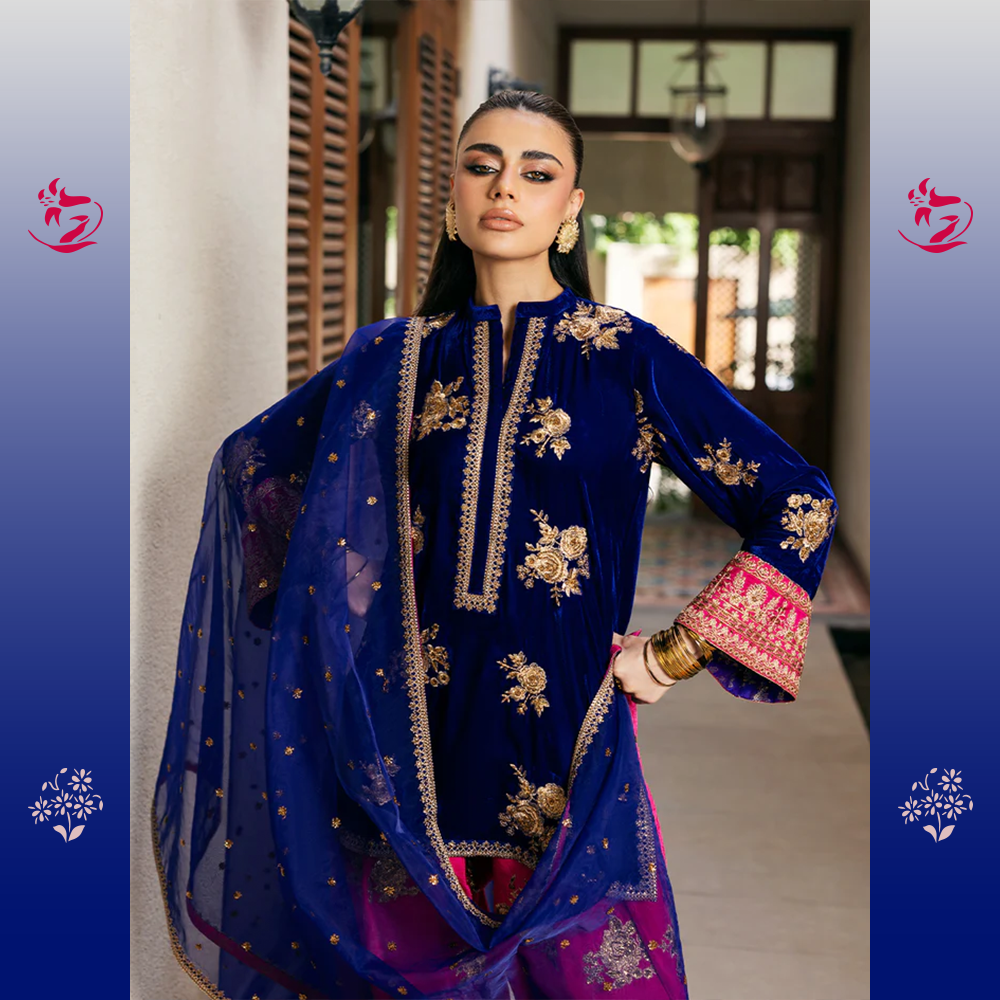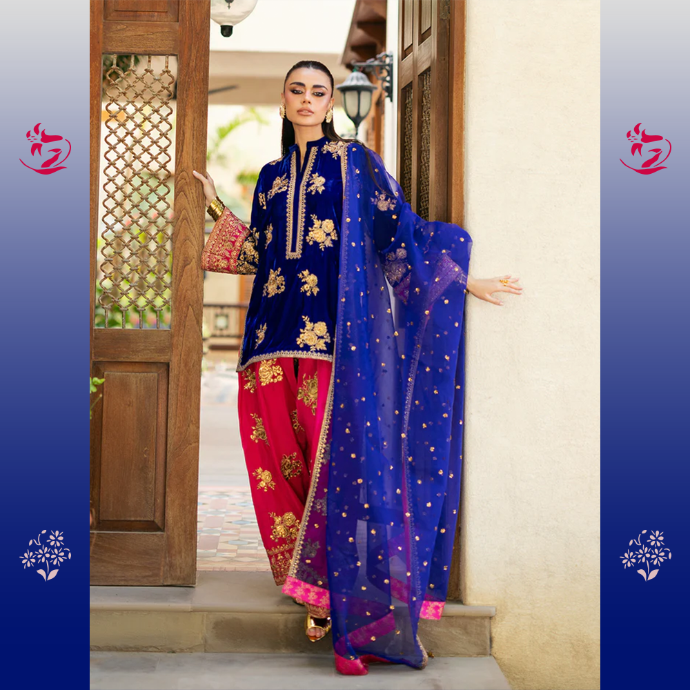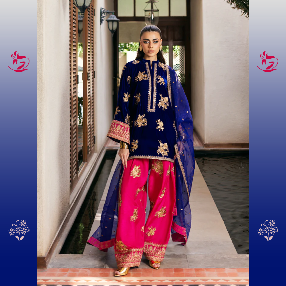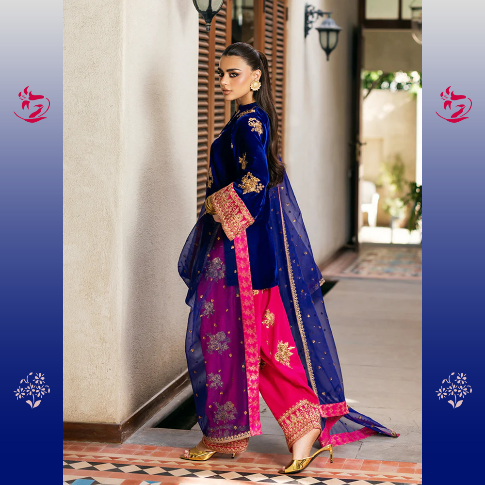 A luxurious three-piece statement-making look with a short Navy Blue Velvet shirt featuring exquisite gold Dabka and Zari embroidery. It provides a daring contrast to the bold Hot Pink Raw Silk Shalwar with embroidered cuffs. The outfit is balanced by a sheer Deep Purple Organza Dupatta, tied together with a thin hot pink embroidered border.