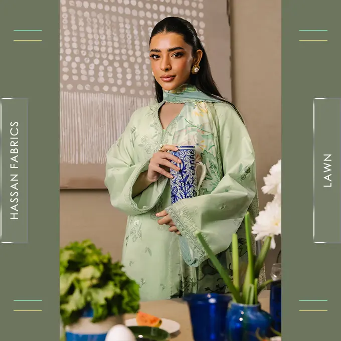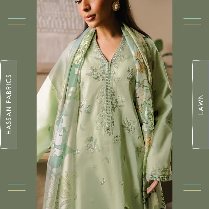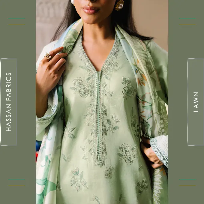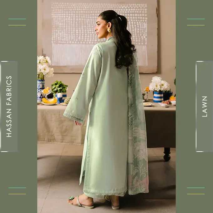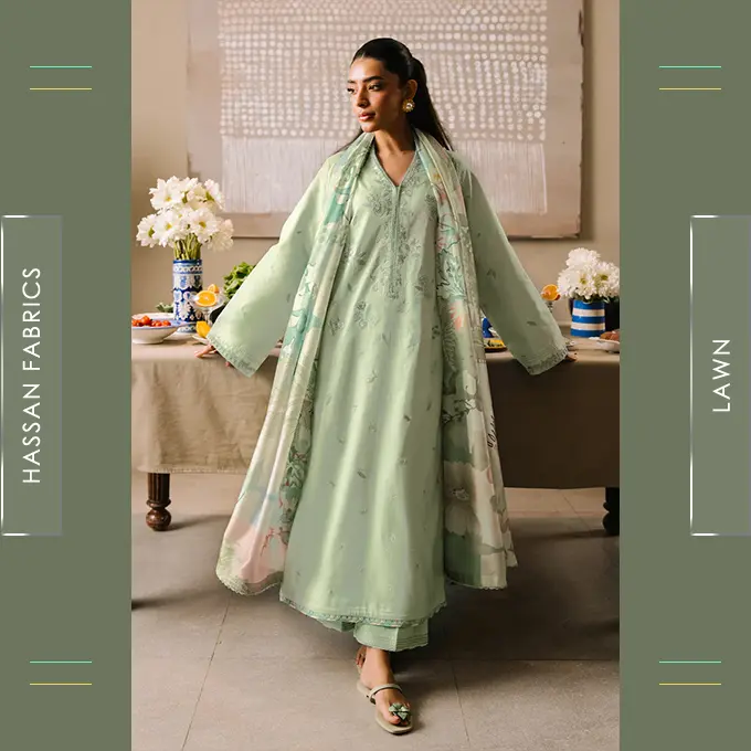 Embroidered lawn shirt, cotton trousers, and silk dupatta combine for effortless elegance. A must-have from summer season collection.