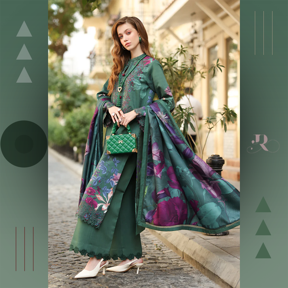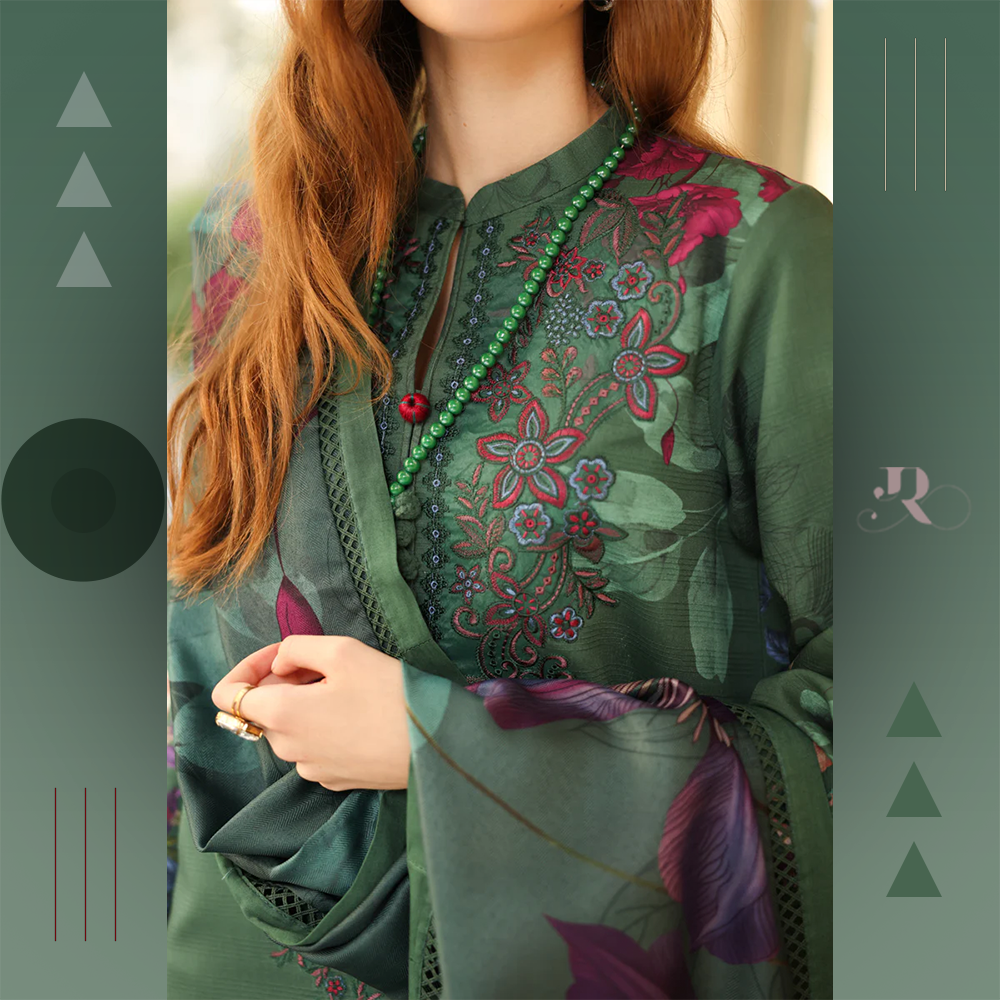 Printed linen 3-piece with embroidered organza neckline and herringbone shawl. Refined and versatile.