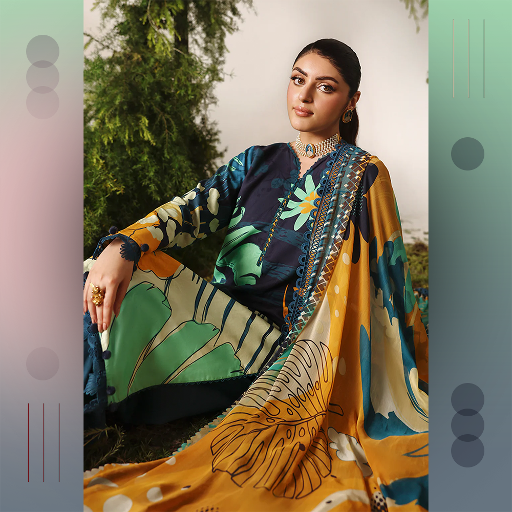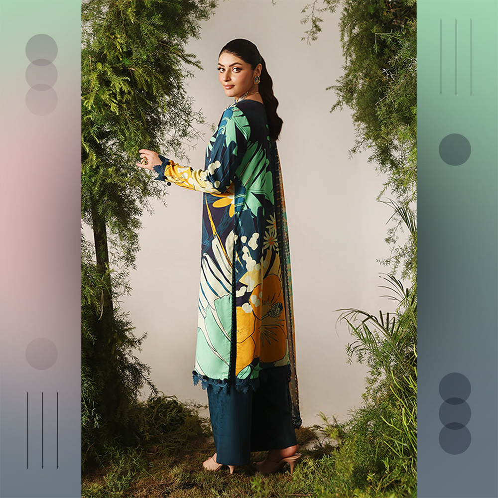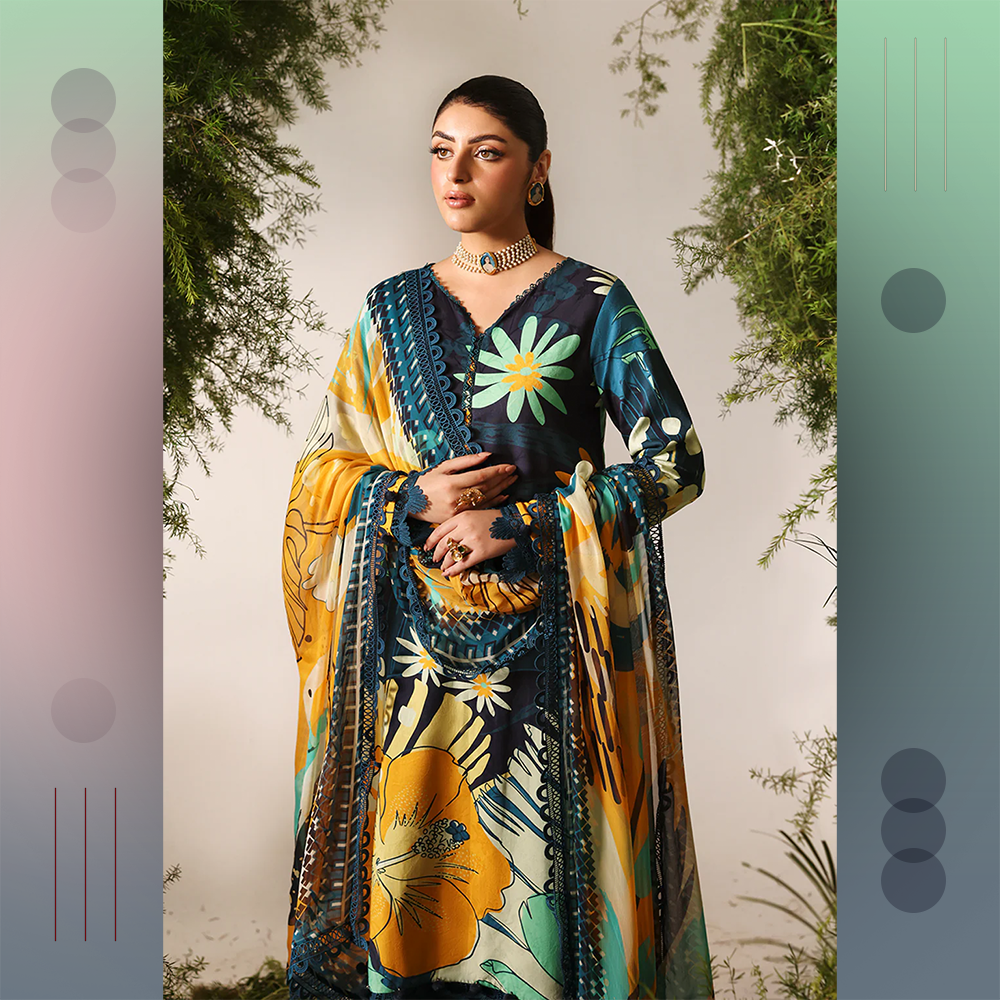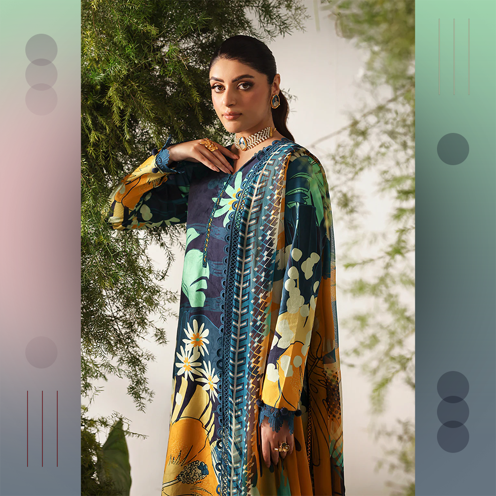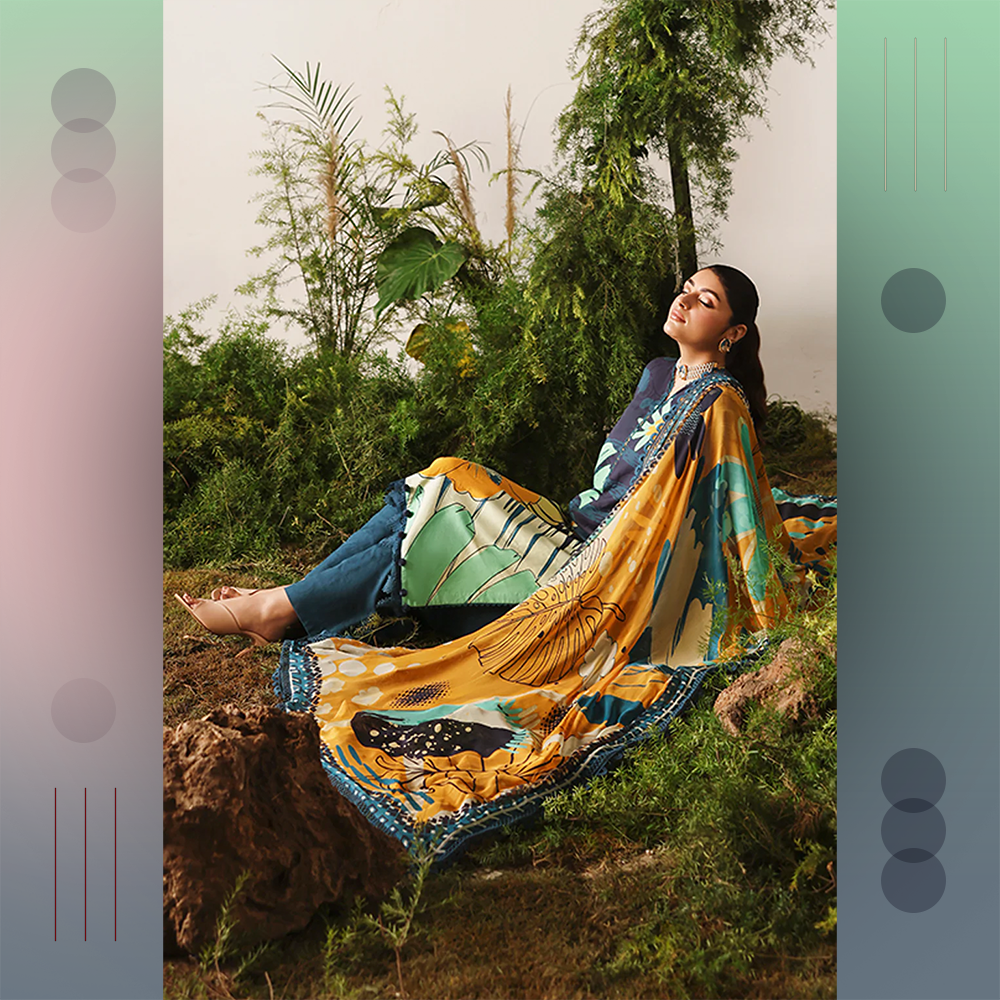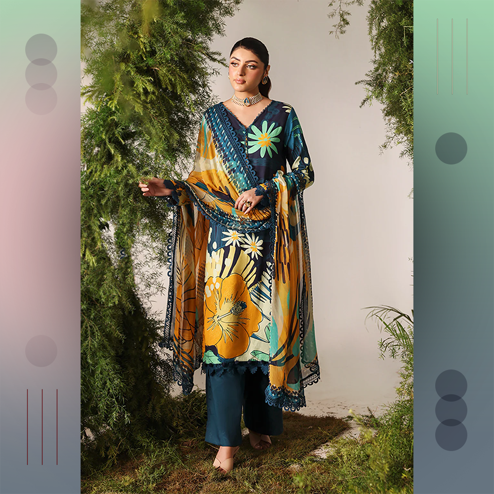 Beautifully printed jacquard viscose shirt with chiffon dupatta and dyed trousers. A graceful unstitched Naqsh outfit for modern elegance.