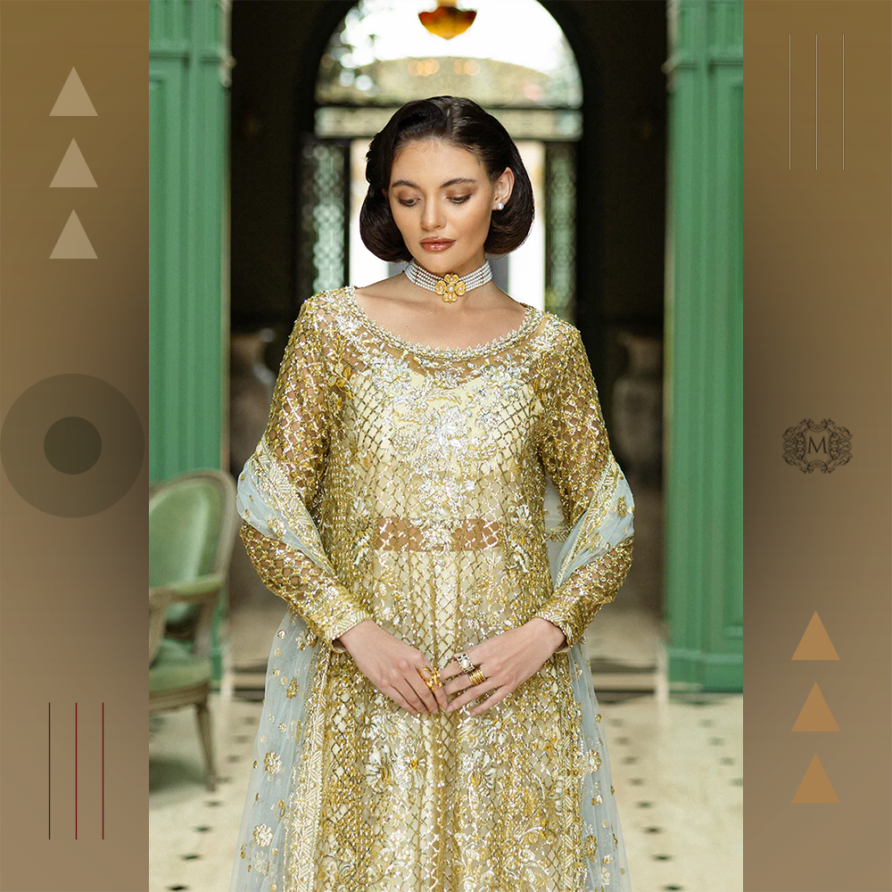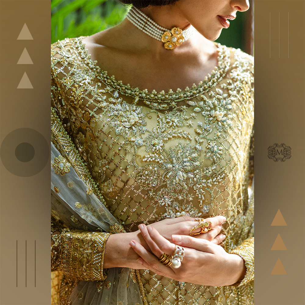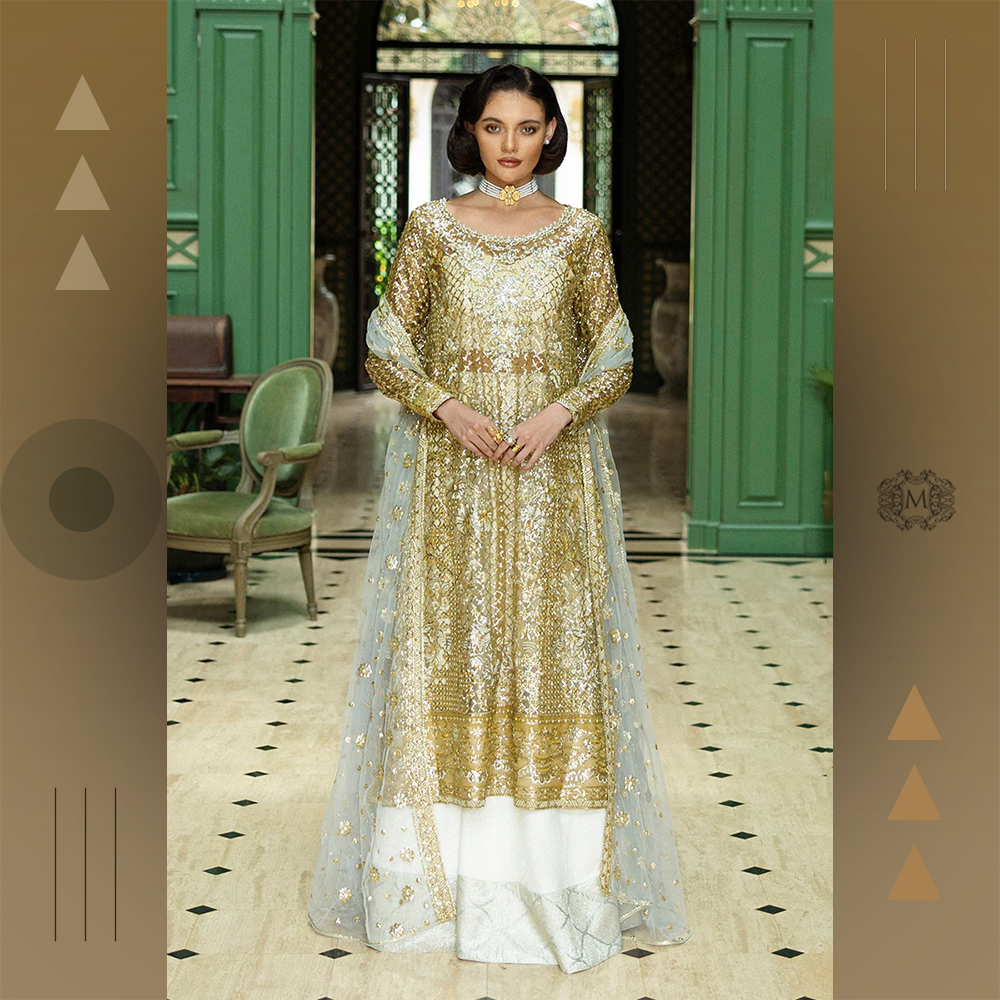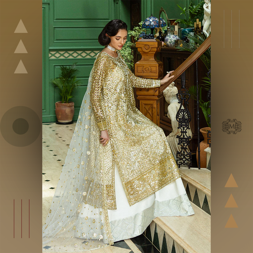 Intricately embroidered silk shirt, sequined net dupatta, and jamawar-detailed raw silk trousers. A statement Mushq bridal 3-piece for graceful celebrations.