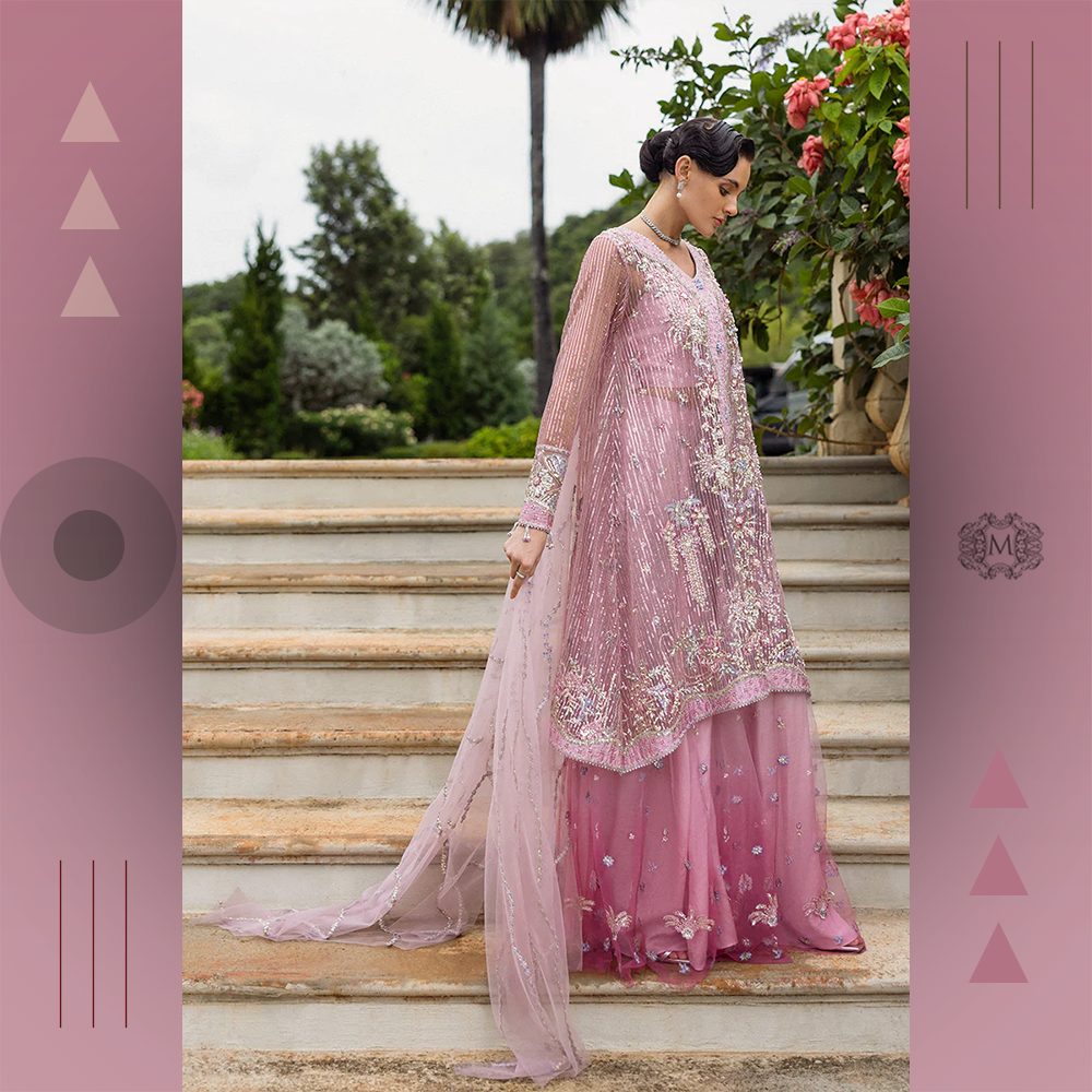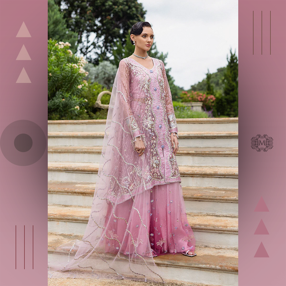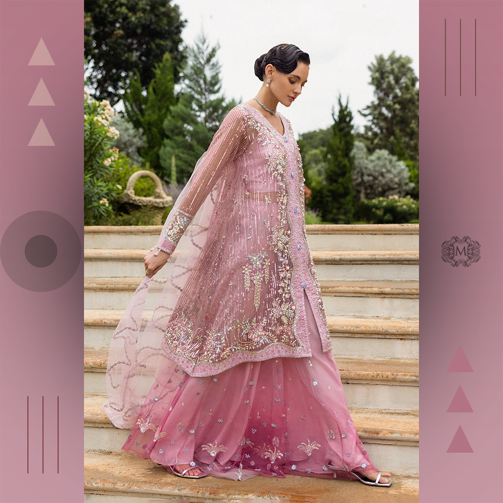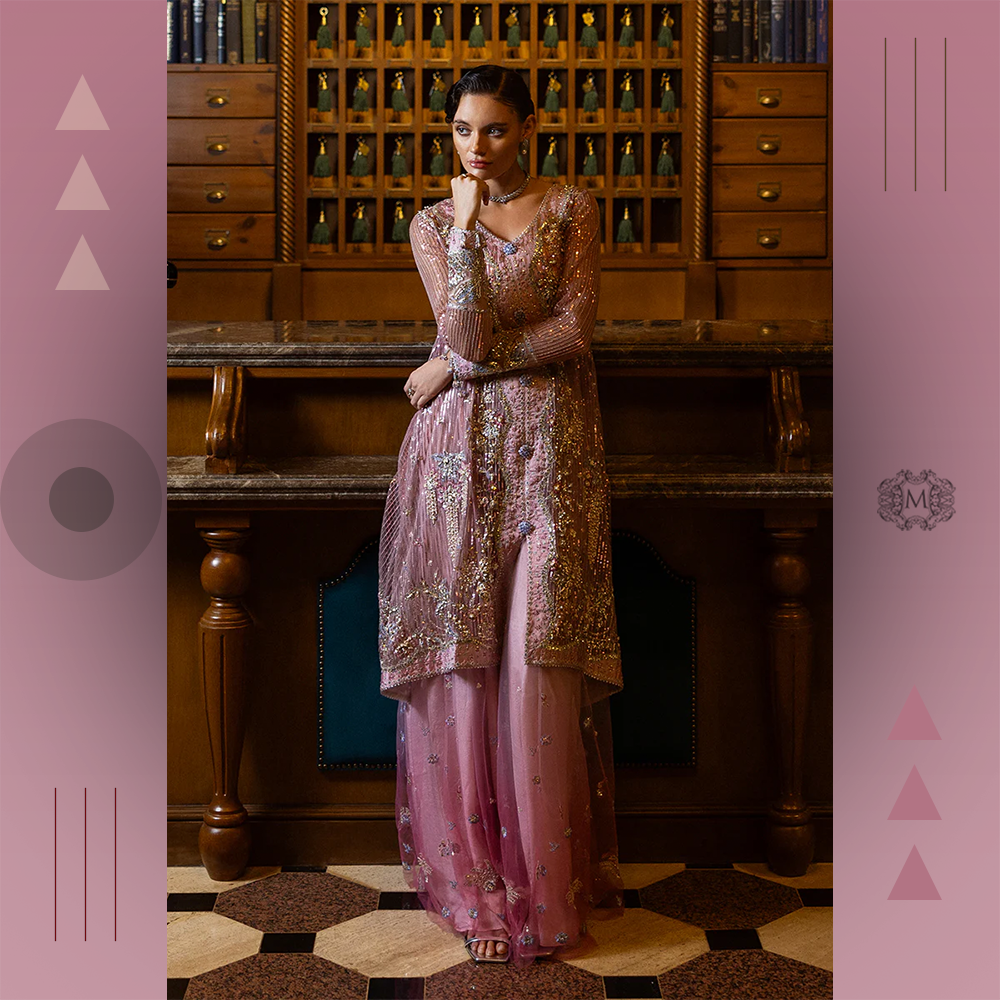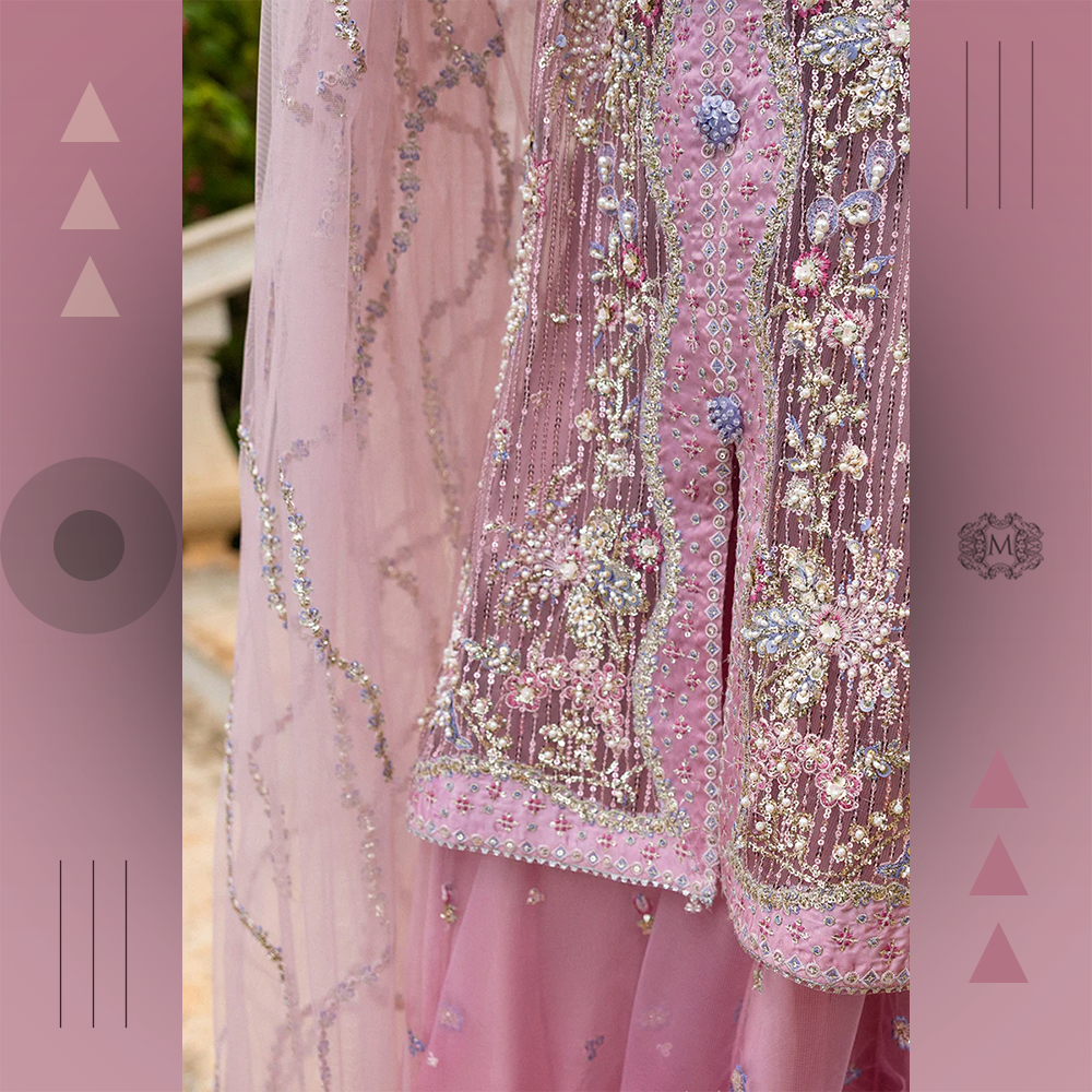 Luxurious embroidered silk shirt with sequined net dupatta and raw silk trousers finished with embroidry. A premium Mushq bridal ensemble for timeless elegance.