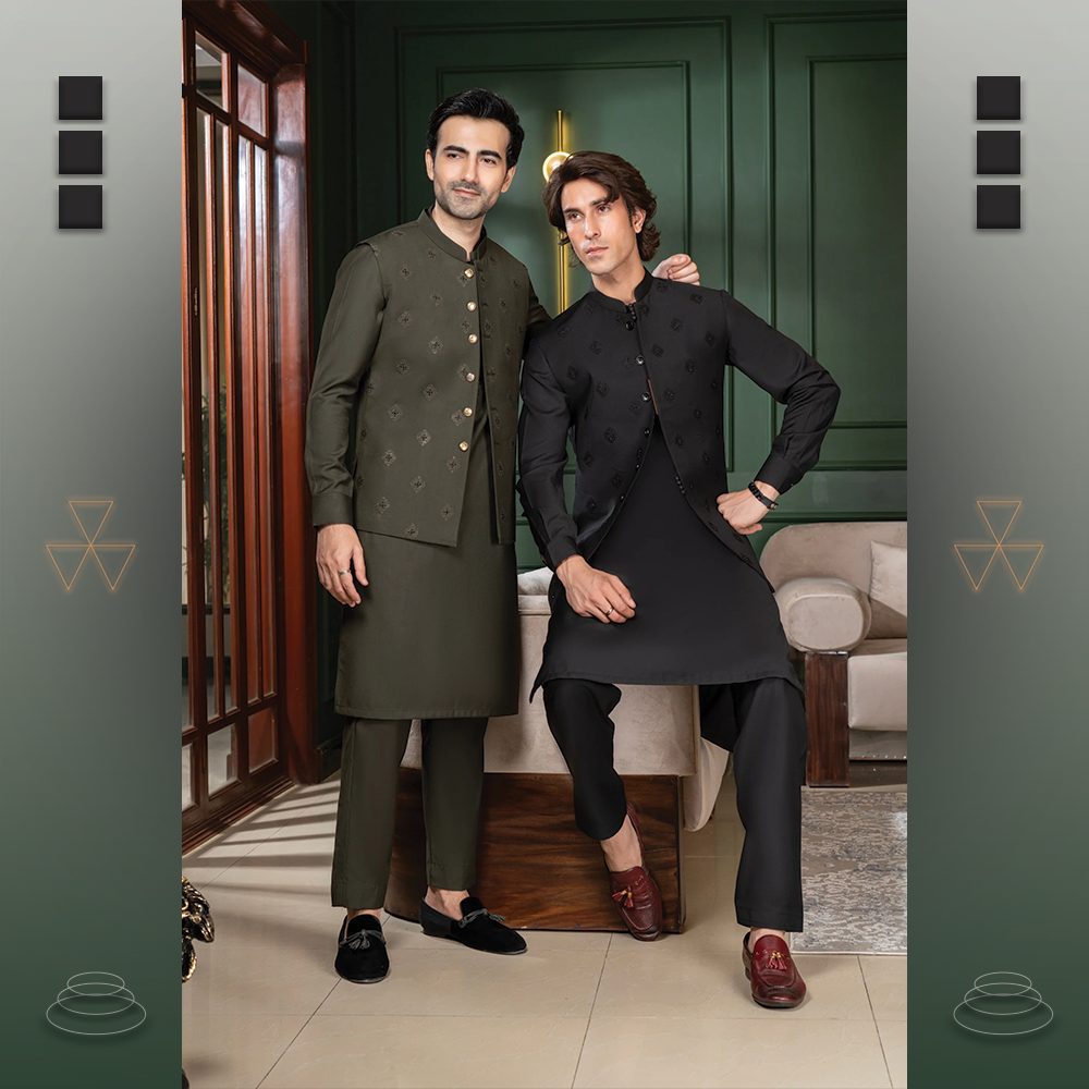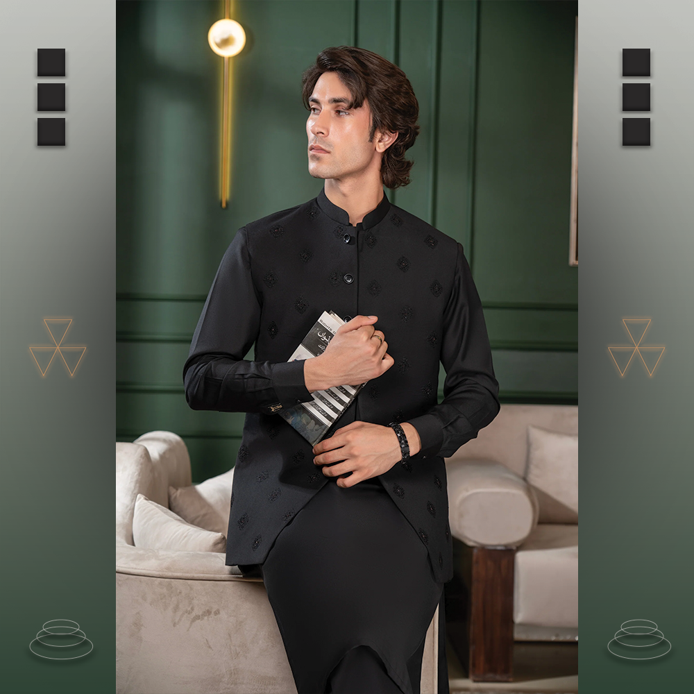 Waistcoat: Intricately embroidered hand-made all-over design, ideal for festive and formal occasions.