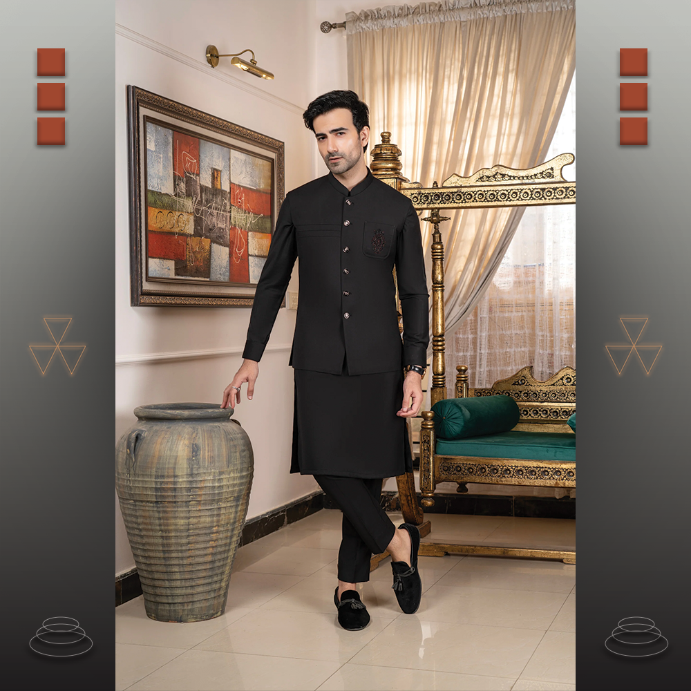 Waistcoat: Intricately embroidered handmade all-over design, ideal for festive and formal occasions.