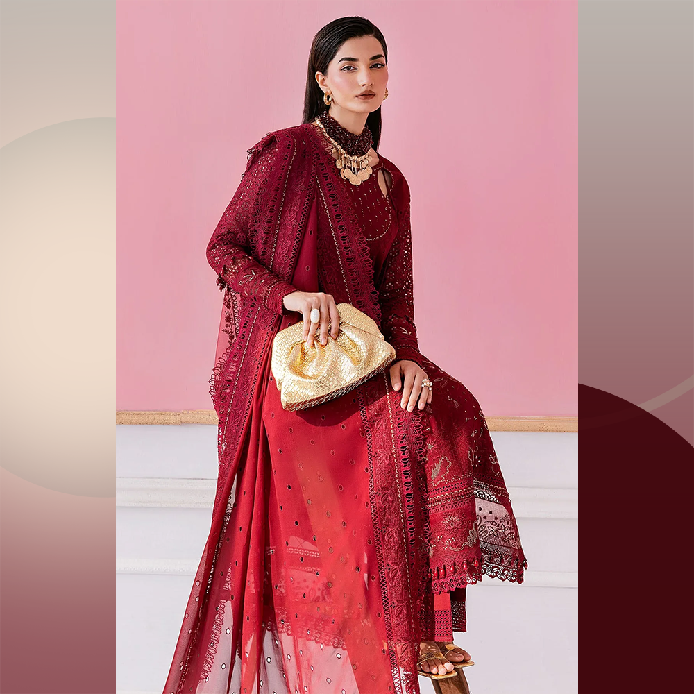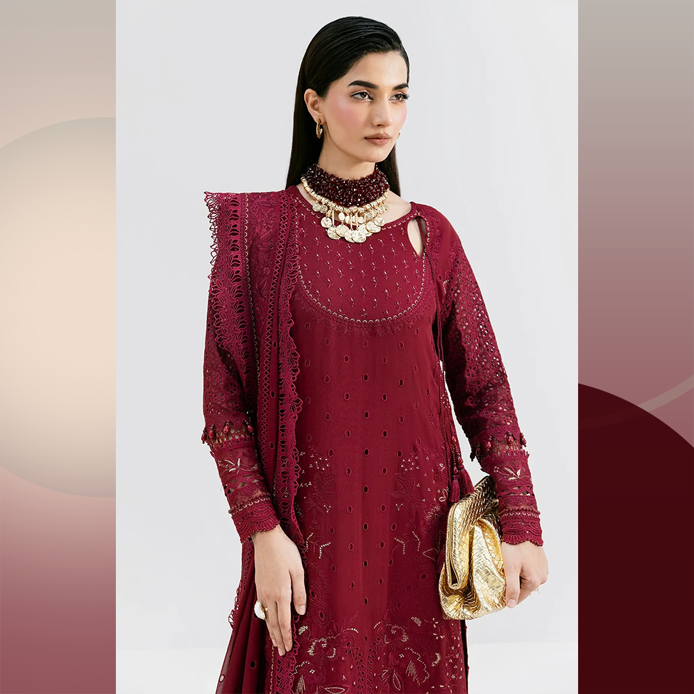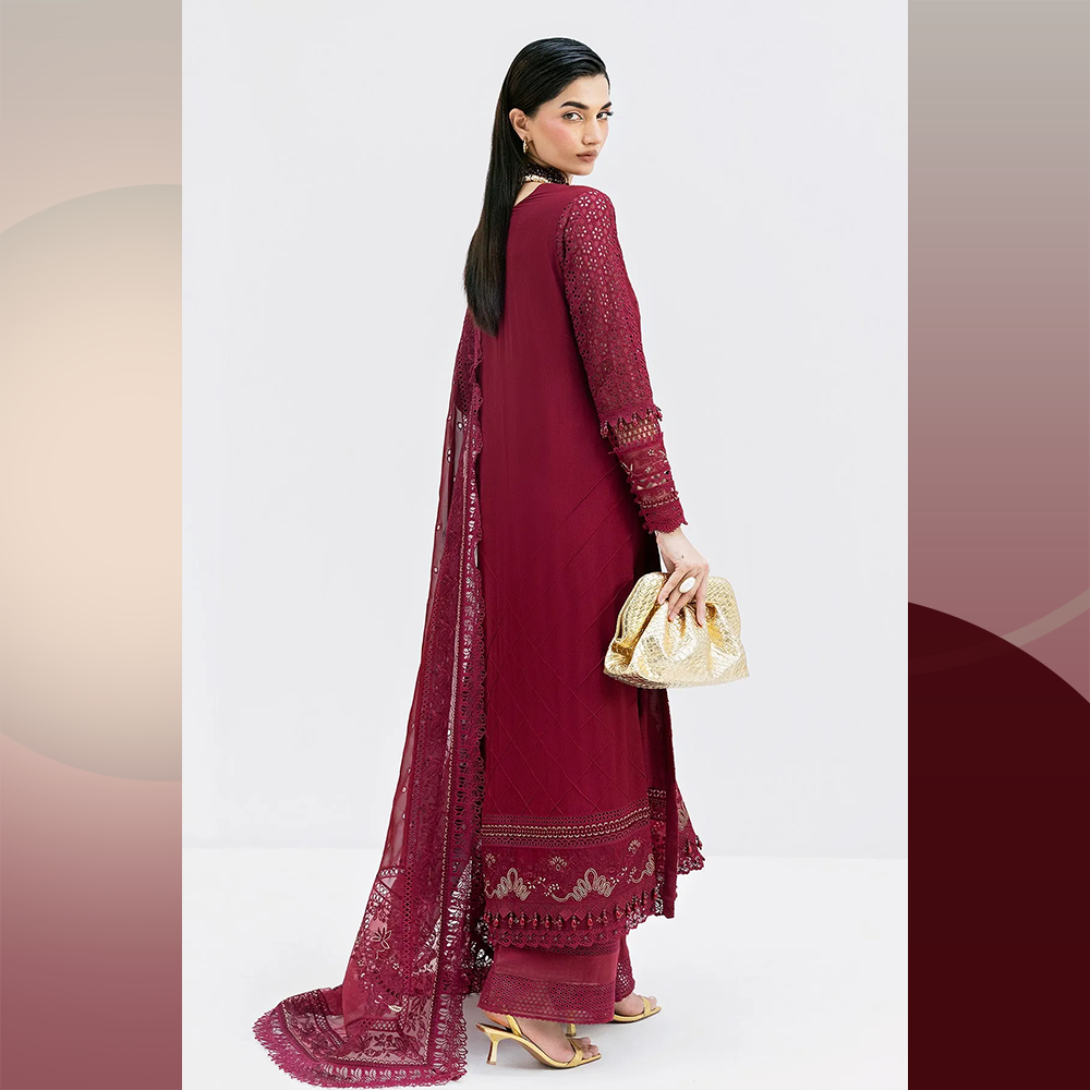 Beautifully detailed georgette shirt with intricate embroidery, georgette dupatta, and raw silk trousers — an ideal festive 3-piece ensemble.