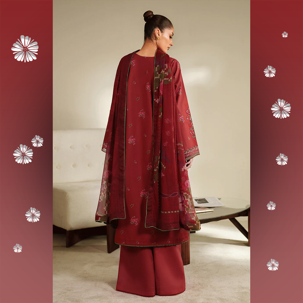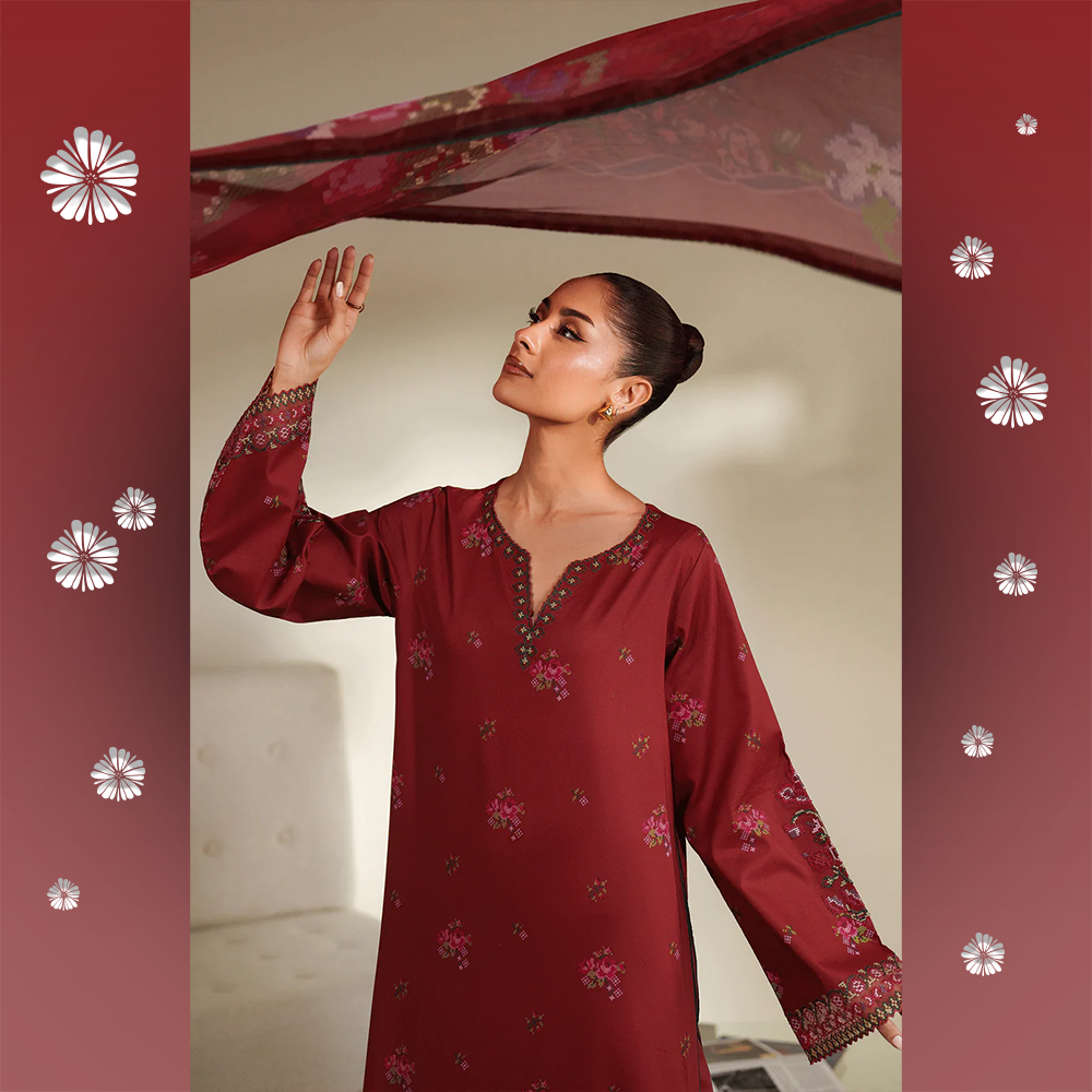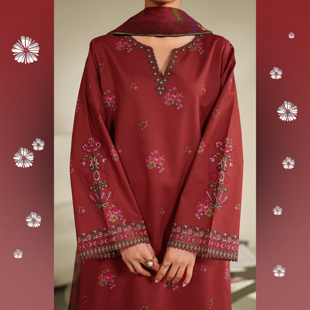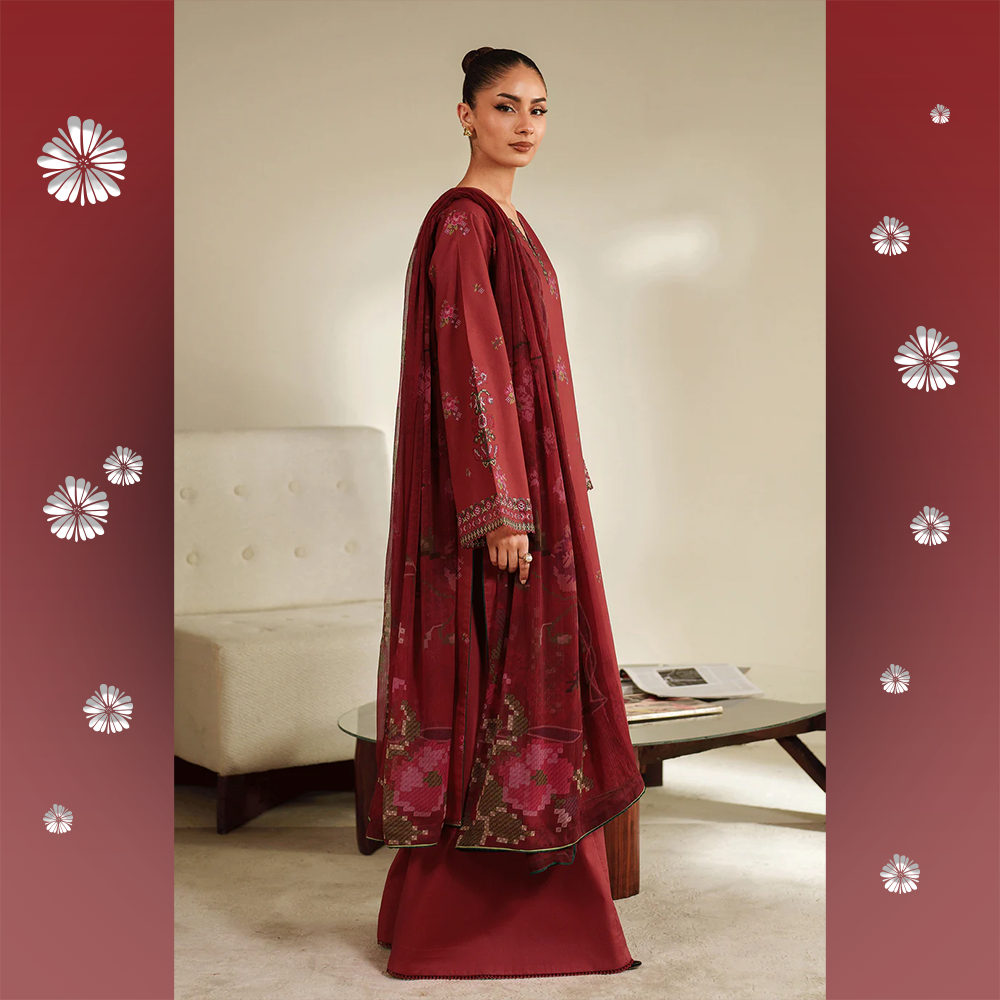 A graceful three-piece set in cambric, featuring a digital printed shirt with floral embroidery on the neckline, sleeve motifs, and sleeve borders. Paired with a digital printed chiffon dupatta and plain cotton trousers, this deep garnet ensemble blends timeless elegance with modern charm.