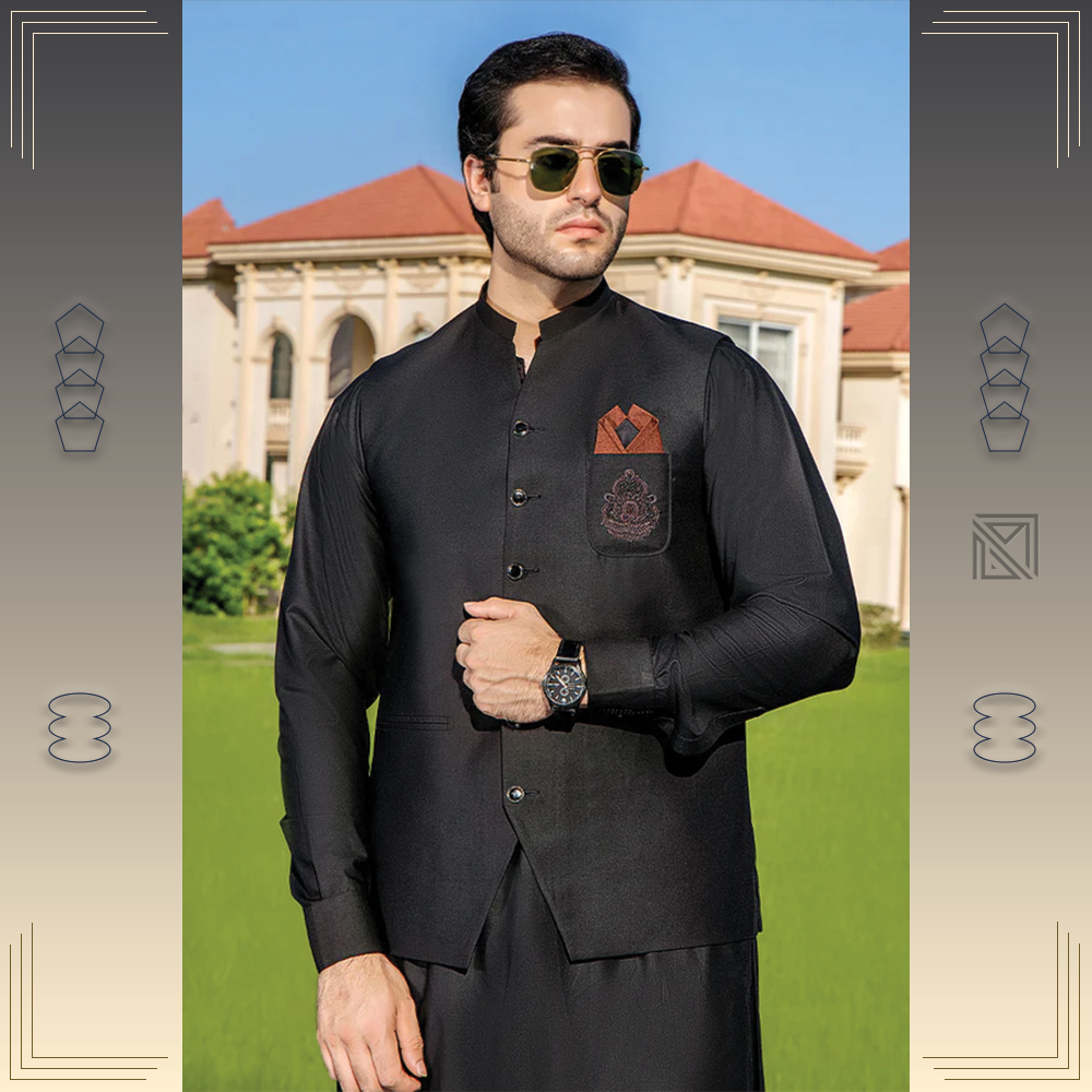 Elegant Riwaj suit and waistcoat set in luxury suiting fabric. Designed for weddings, receptions, and grand festive occasions.