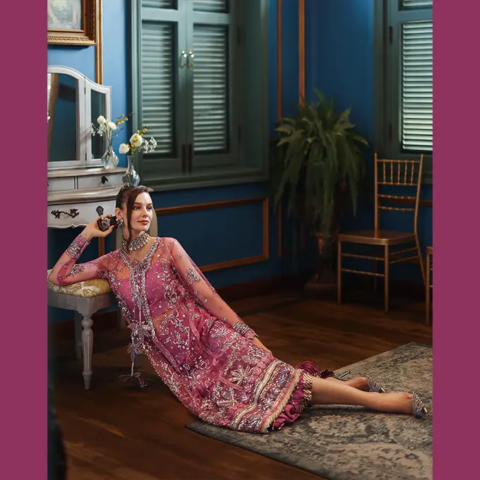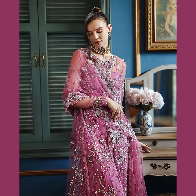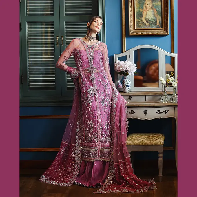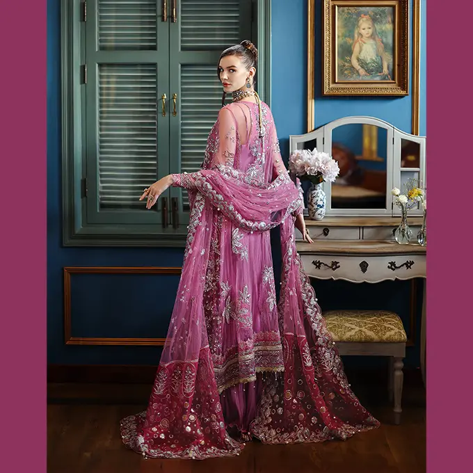 Embroidered shirt with hand embellishments, sequined net dupatta, printed lehenga and, dyed under shirt. A regal Mushq bridal unstitched masterpiece.