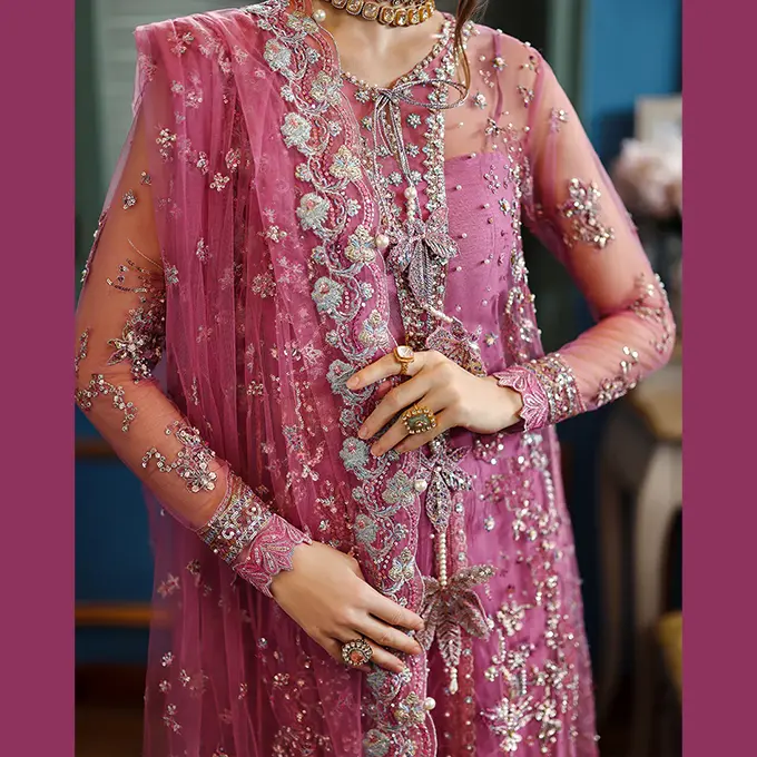 • Embroidered, sequined & pearl embellished front daman border (organza)