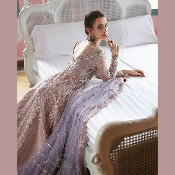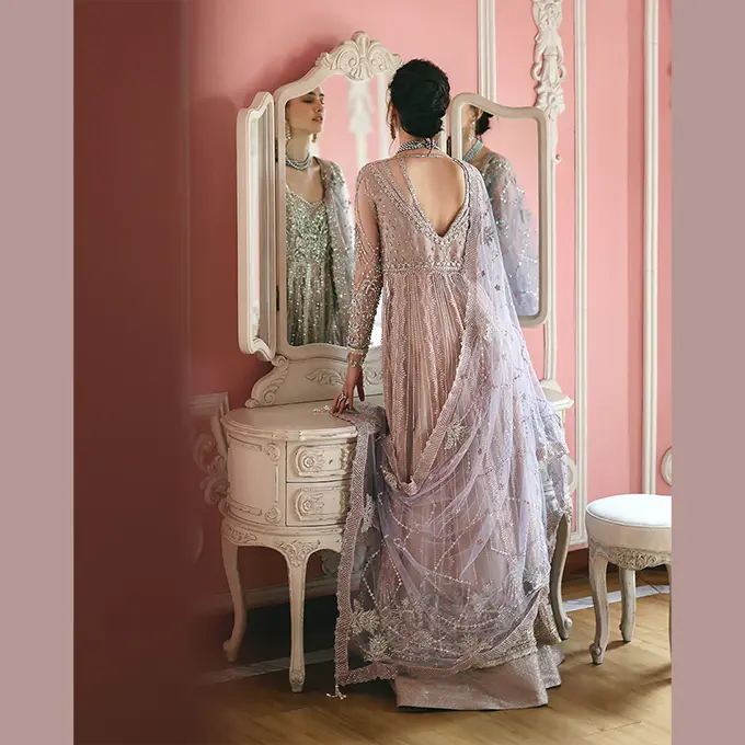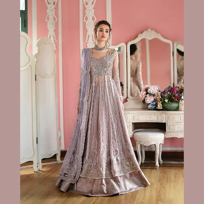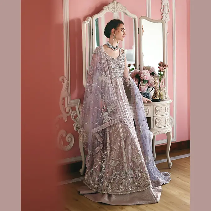 Embroidered shirt with hand embellishments, sequined net dupatta, printed lehenga and, dyed under shirt. A regal Mushq bridal unstitched masterpiece.
