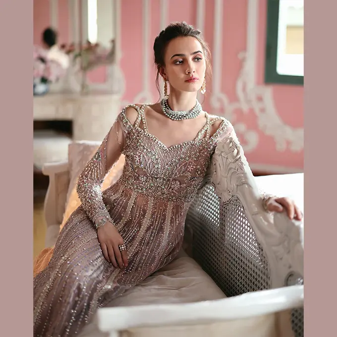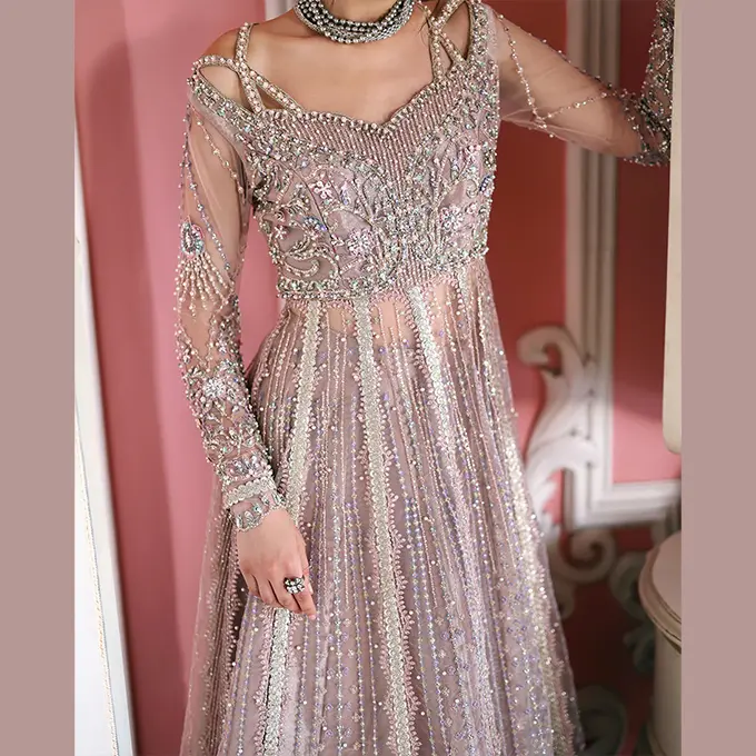 • Embroidered, sequined & pearl embellished front panel (net)