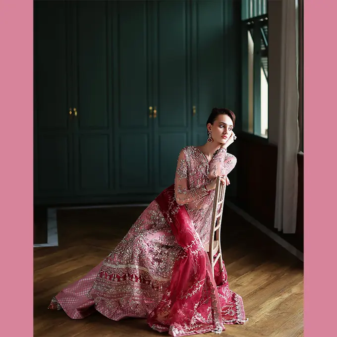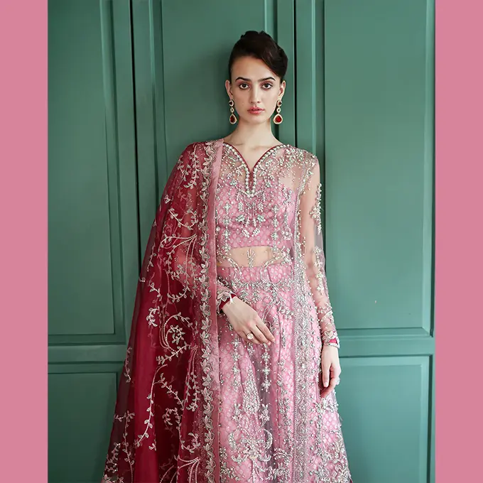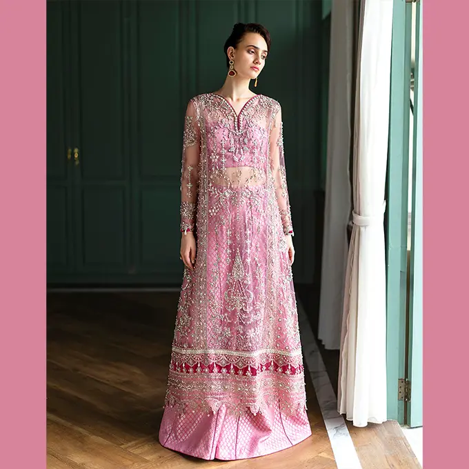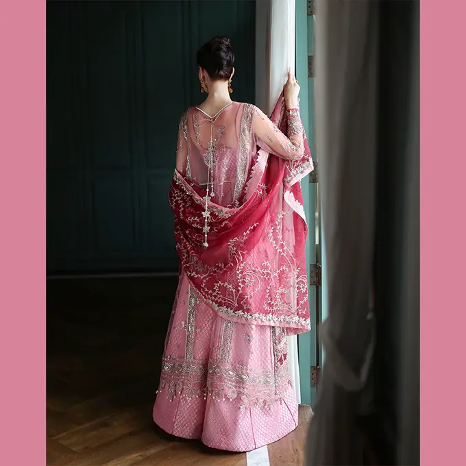 Embroidered shirt with hand embellishments, sequined net dupatta, printed lehenga and, dyed under shirt. A regal Mushq bridal unstitched masterpiece.
