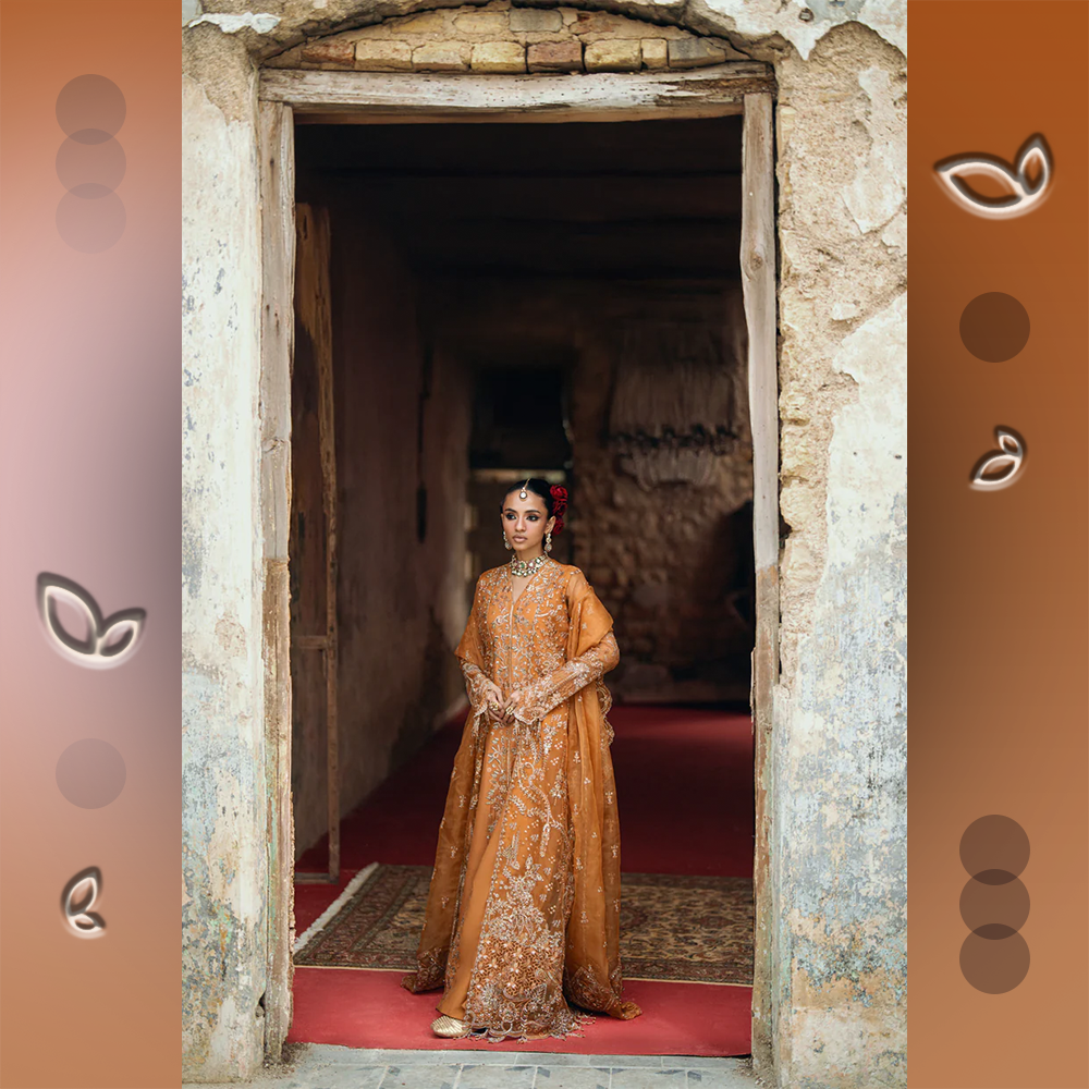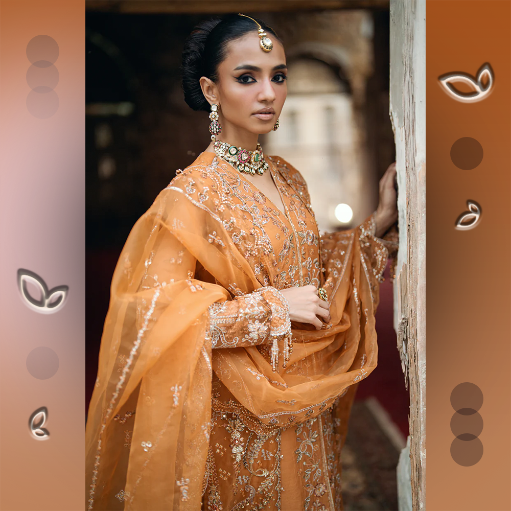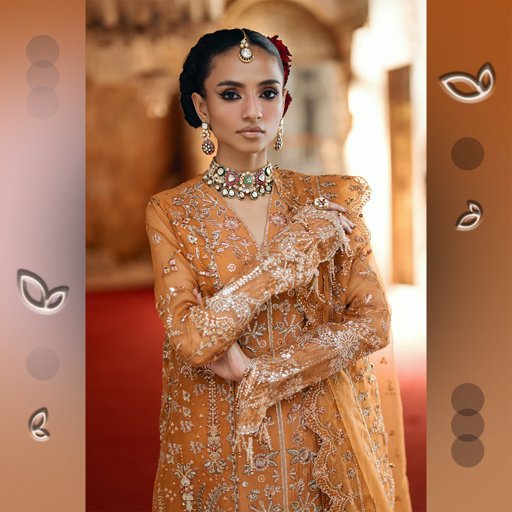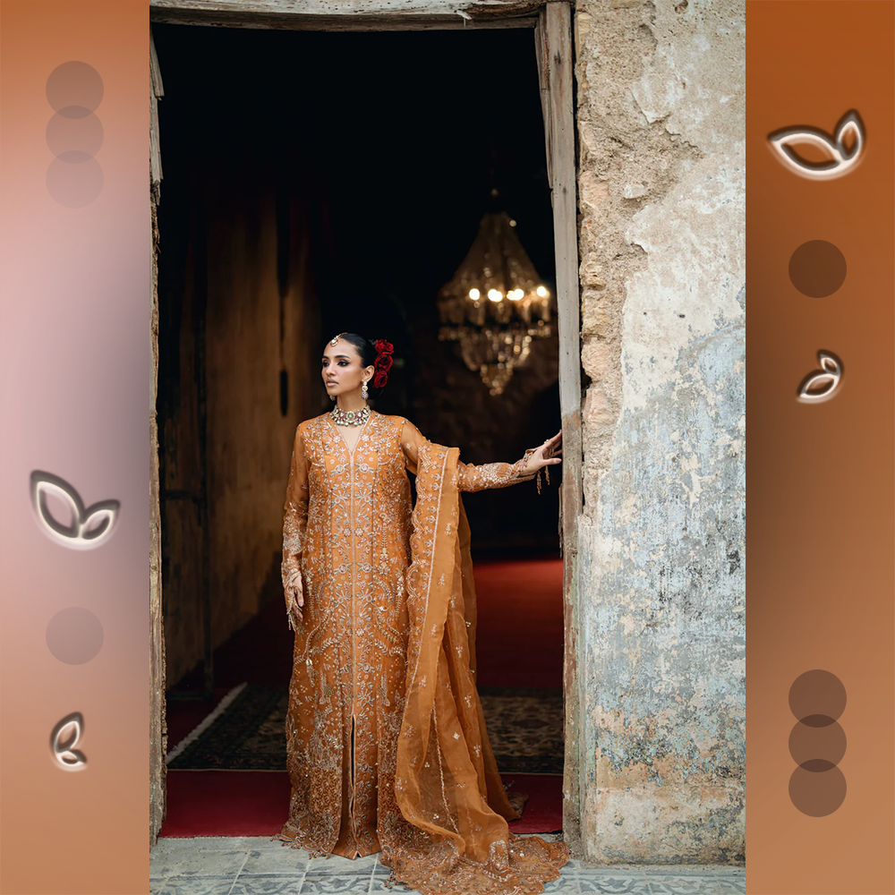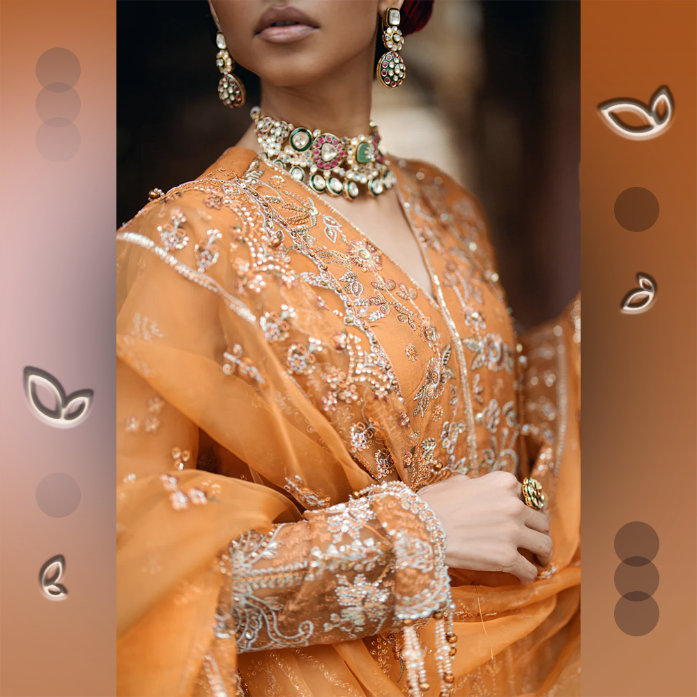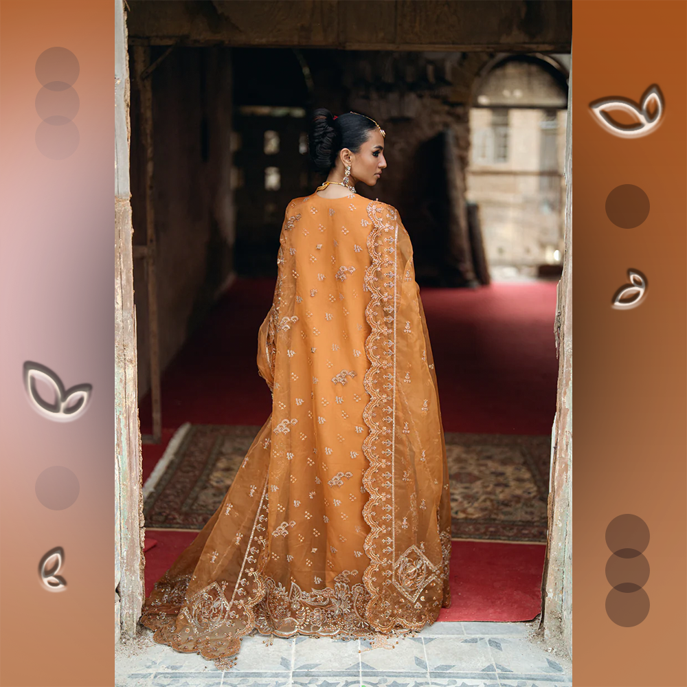 Premium embroidered raw silk ensemble featuring detailed borders, embroidered organza dupatta, and cotton silk trousers for timeless elegance.