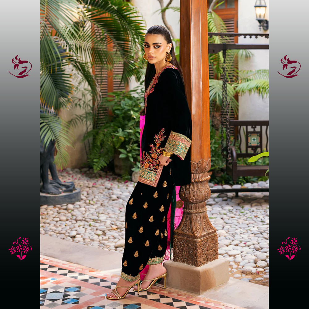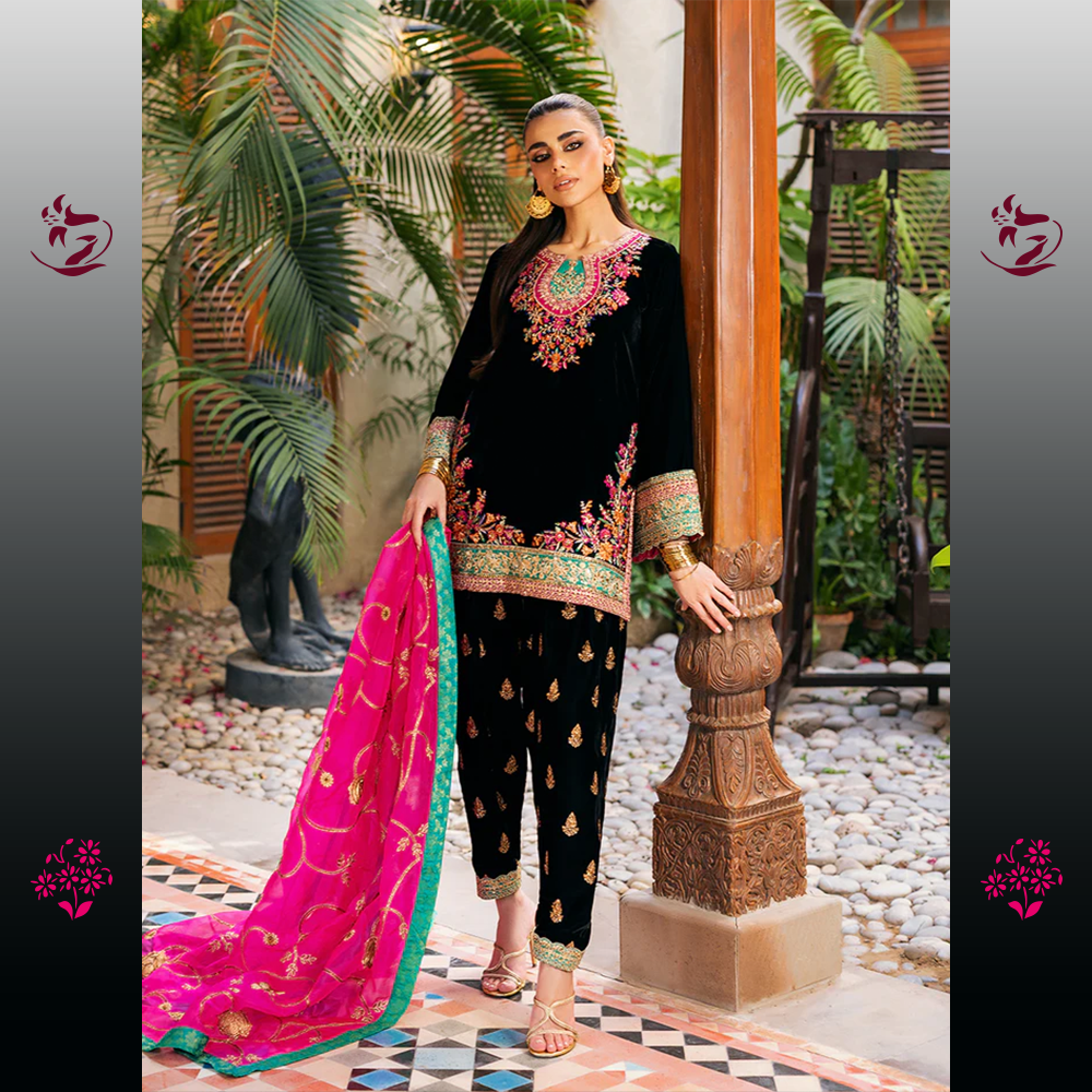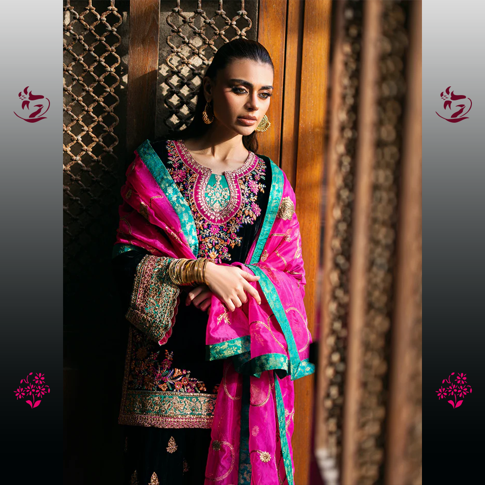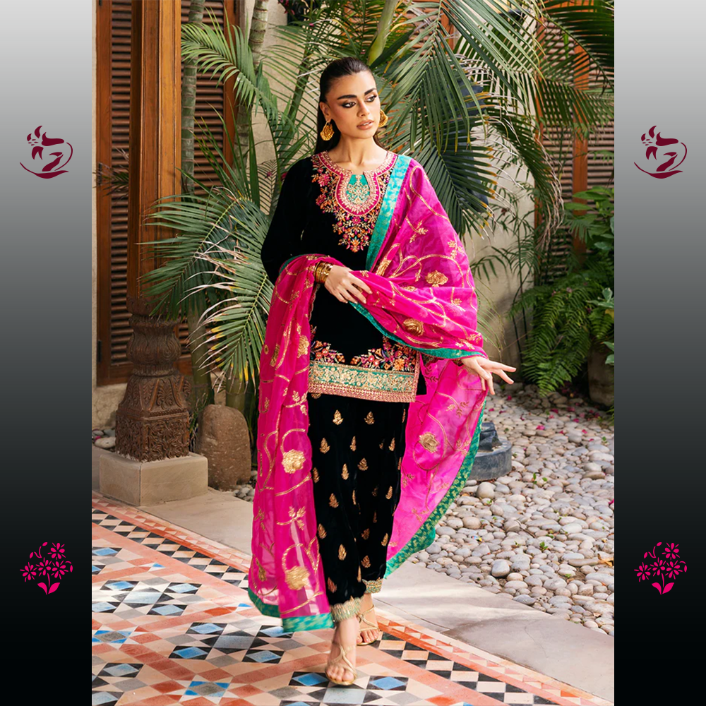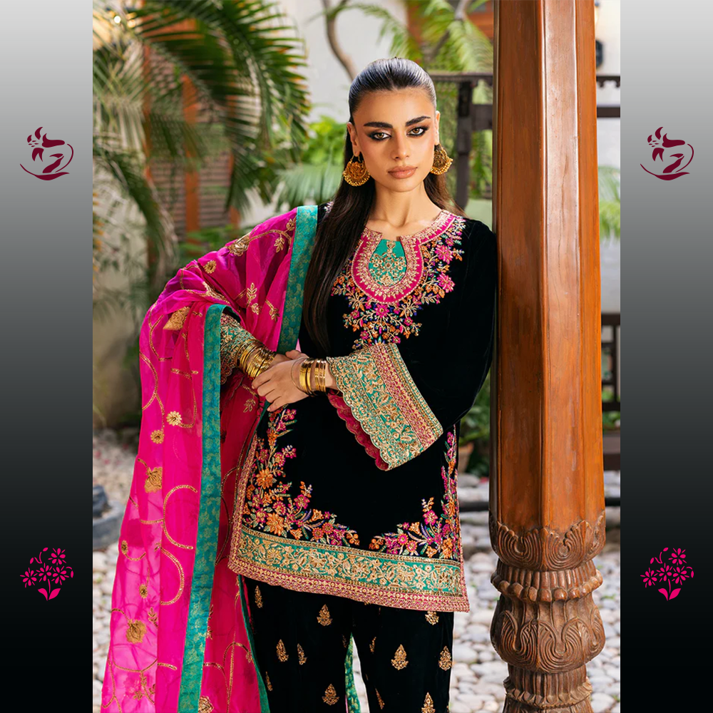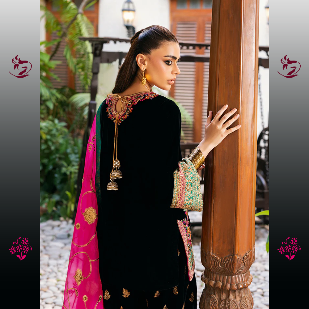 A classic and dramatic unstitched ensemble in bold Black Velvet. The shirt is richly embellished with intricate multicolored thread-work embroidery on the neckline, sleeves, and borders, creating a striking contrast. It is crowned with a dazzling Hot Pink Organza Dupatta, finished with a bold turquoise border and delicate embroidery for an unforgettable statement.